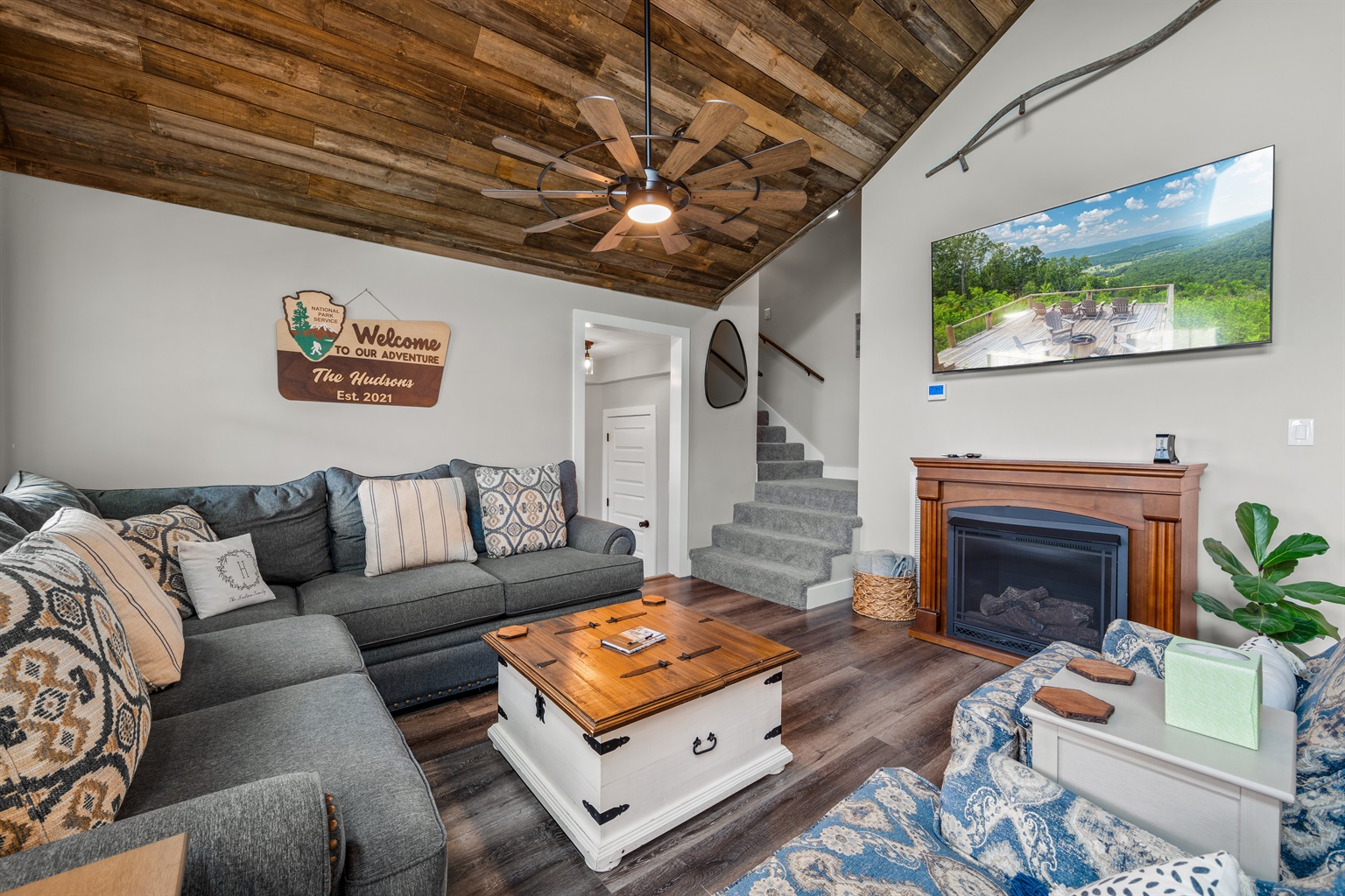 In the large living area, kitchen and dining area, you will love the beautiful wood ceiling that was built by the homeowners and upcycled from hurricane-weathered wood planks on Alabama's own coast in Baldwin County. Moving into the main living area, known as "The Gathering Place," you will appreciate the sight of a large comfortable furniture and a gas log fireplace. There is plenty of room for your family to enjoy this space with a 70" HD smart television as well as books, games and puzzles. A small half bathroom adjoins the living area for your convenience.