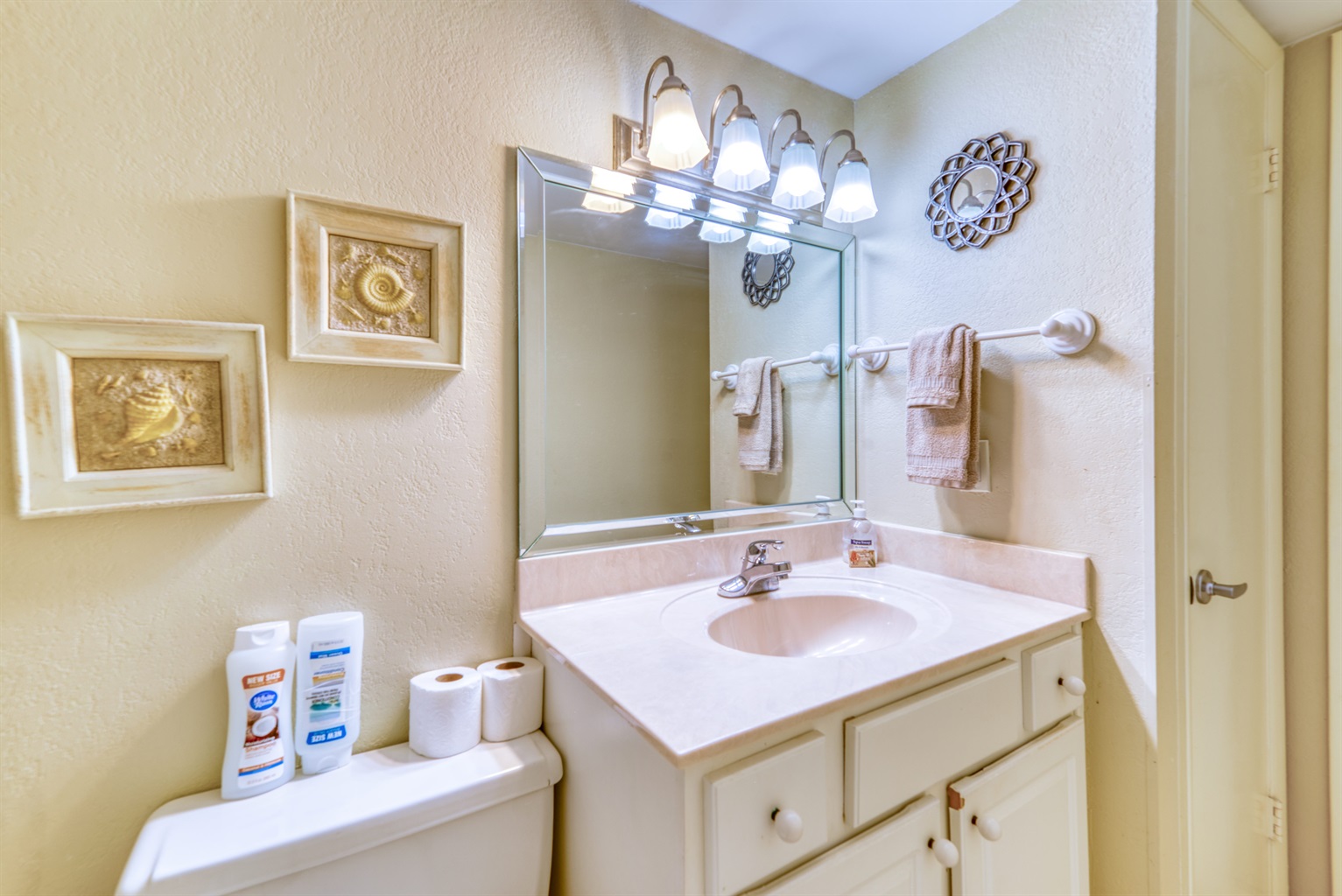 This condo can conveniently accommodate a party of 8. The master bedroom has a king-sized bed that comfortably sleeps 2, as well as a private, full bathroom attached to it. The guest bedroom has 1 queen size bed and 1 bunk bed along with an attached full bathroom that is also accessible from the living room area. The living room is equipped with plenty of comfortable seating for lounging and relaxing throughout the day during your breaks from the beach, as well as a pull-out sleeper sofa bed that can comfortably sleep 2. The total sleeping accommodations for this condo is 8 guests.