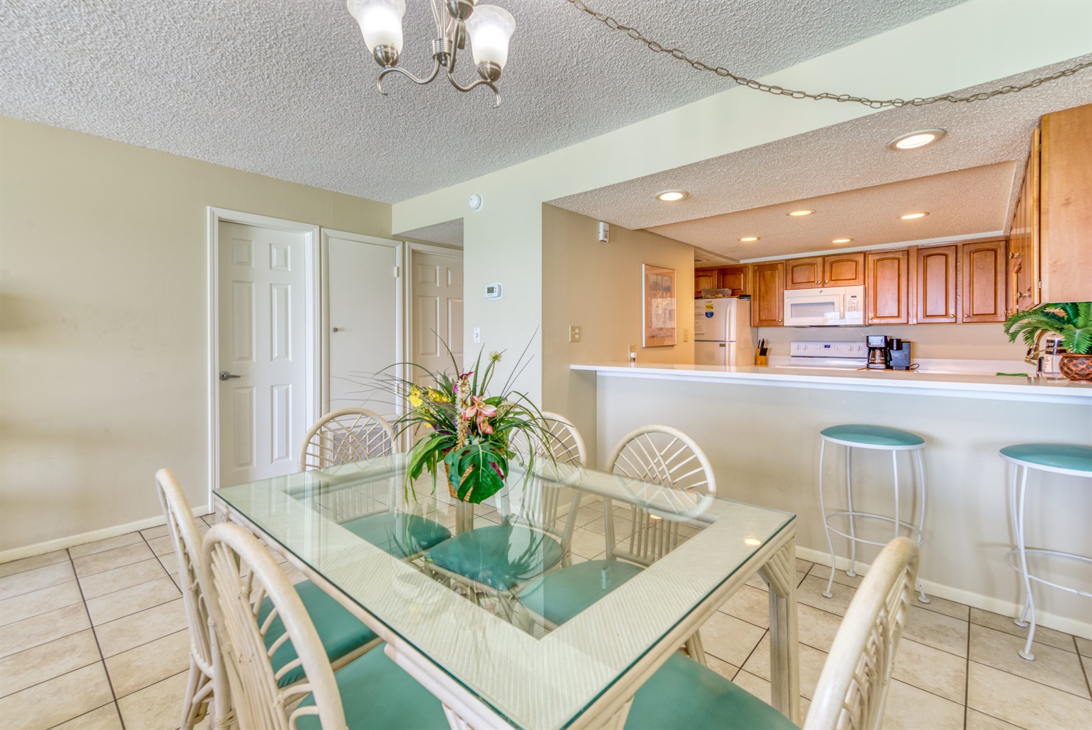 The kitchen is fully equipped with all major and small appliances including refrigerator, stove, dishwasher and microwave & more. Cookware, utensils, and table service are all included, with a private washer and dryer located conveniently inside the condo.