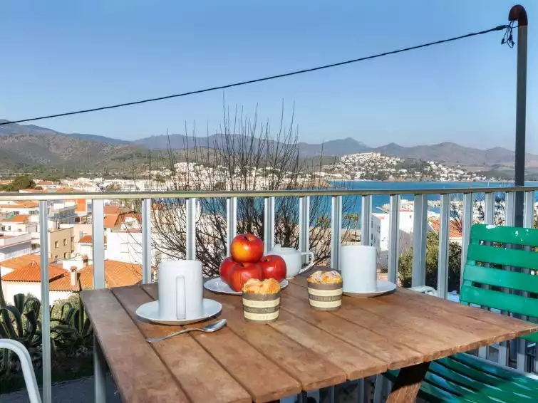 El Port: Terraced house "Dalí II", 2 storeys, semi-detached. In the district El Port de Llançà, in a central, quiet, sunny position on top of a hill, 200 m from the sea, 200 m from the beach, in a cul-de-sac, north facing position. Private: courtyard, public parking on the road. Shop 200 m, supermarket 300 m, restaurant, bakery 200 m, bus stop "Ayuntamiento Llançà" 1.2 km, railway station "Llançà" 2.2 km. Golf course (18 hole) 18 km, surf school 300 m. Nearby attractions: Golf Peralada 18 km, Aquabrava (Aquapark) Roses 18 km. Hiking paths: Parc natural del Cap de Creus, Serra de Rodes, Parc natural de l'Albera. Please note: no lift. The owner does not accept any youth groups."Dalí II", 4-room terraced house 100 m2 on 2 levels, north facing position. Practical and comfortable furnishings: living/dining room, on 2 levels with dining table, digital TV and flat screen. Exit to the balcony. Kitchen (oven, dishwasher, 4 ceramic glass hob hotplates, toaster, microwave, electric coffee machine). Sep. WC. No heating option. Upper floor: 1 room with 1 french bed (1 x 135 cm), air conditioning. Exit to the balcony. 1 room with 2 beds (80 cm). 1 room with 1 bed (110 cm). Bath/bidet/WC. No heating option. Large terrace. Terrace furniture. Marvellous view of the sea, the countryside and the resort. Facilities: washing machine, iron. Internet (WiFi). Please note: maximum 1 pet/ dog allowed. TV only ES. HUTG-023486