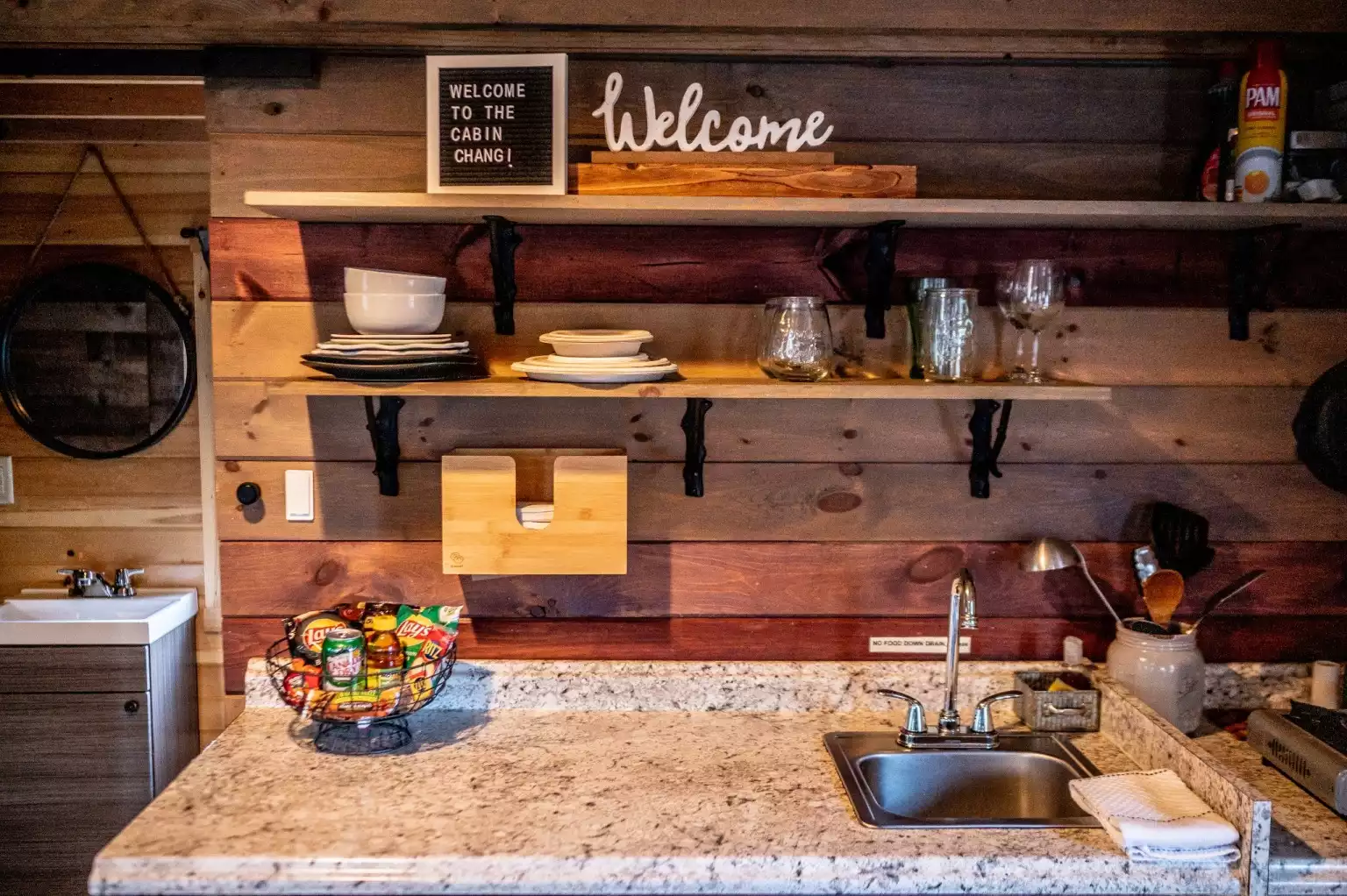 The cabin is equipped with a queen bed and sofa bed. The sofa bed pulls out to sleep an adult or child. There is a kitchenette area with fridge to store your drinks/food. There is a dvd with some dvds to choose from if you didn’t bring your own. We also have games and a classic nintendo to have some good old fashion camping fun.
