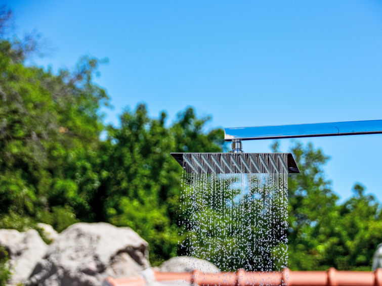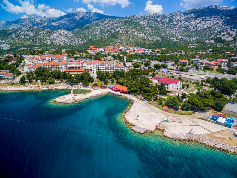 Ribarica 5 km from Karlobag: Apartment house "Delfin". In a quiet, sunny position, 250 m from the sea, 250 m from the beach. For shared use: property 400 m2, swimming pool angular (12 x 4 m, depth 130 cm, seasonal availability: 01.Jun. - 15.Sep.) with internal staircase. Outdoor shower. In the house: restaurant, internet access. Half board possible on request (extra). Parking at the house on the premises. Shop 4 km, bus stop 1.3 km, pebble beach 600 m, rocky beach, concrete beach 250 m.3-room apartment 35 m2 on 2nd floor. Living/dining room with 1 sofabed (130 cm, length 200 cm), satellite TV (flat screen), air conditioning. Exit to the terrace. 1 room with 1 french bed (140 cm, length 200 cm). 1 room with 2 beds (80 cm, length 200 cm). Open kitchen (2 hot plates, microwave, electric coffee machine). Bath/WC. No heating option. Terrace 7 m2 partly roofed. Terrace furniture. Marvellous view of the sea. Facilities: hair dryer. Internet (WiFi, free). 1 small pet/ dog allowed.
