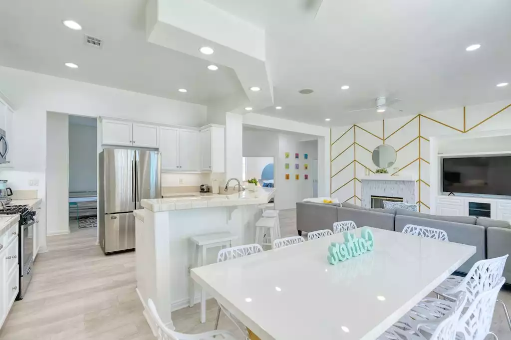 Arrive at Desert Haven with open high ceilings and wall to wall windows. She will welcome you with a bright and open airy concept and over 2000 ft sq of indoor space. Melt away into the new plush furnishings and enjoy the mid century modern glam design. This space has been completely redesigned from head to toe. Cozy up with the newly remodeled fireplace, throw blankets and a good book. Laugh while watching for your favorite movie and tv show on Netflix on the 70” Smart TV. Gather around the designer dining table and modern seating for 10, while making forever memories with family and friends. Enjoy the board / card games, arcade video games or a game of foosball to entertain the whole group.