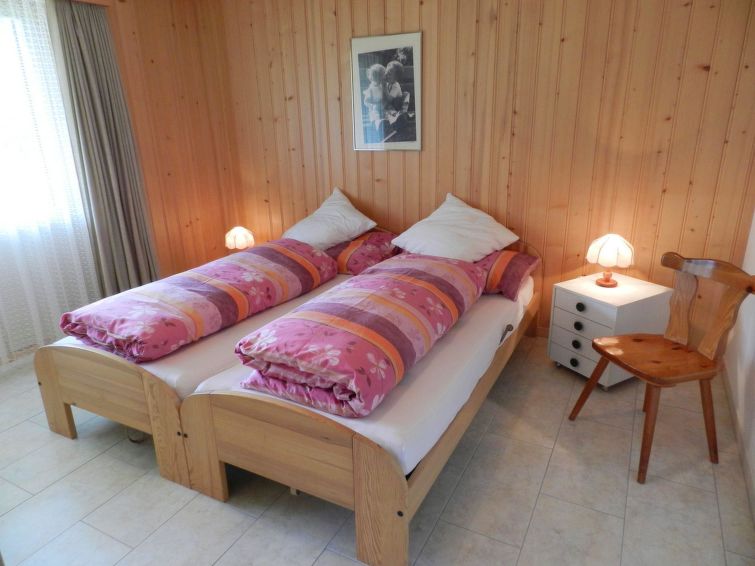 Living / dining room with dining table, sofa which converts into a conventional bed (140x190cm, for max. 1 adult or 2 children), 2 armchairs, TV (Swisscom) and open-plan kitchen (equipped among other things with oven, refrigerator with freezing compartment, coffee machine with capsules (Dolce Gusto), toaster, electric kettle as well as a raclette- and fondue set). 1 bedroom with 2 pushed toghether single beds (2x90x200cm). 1 bathroom with bathtub and toilet. WiFi.