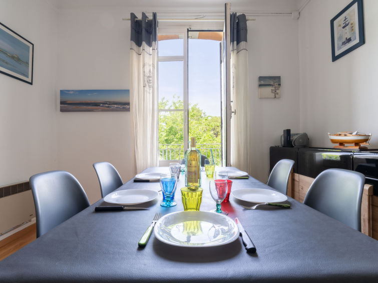 Arcachon: Beautiful residence "Durandal". In a quiet position in the residential district, 250 m from the sea, 250 m from the beach, direct access to the beach. Grocery 300 m, shopping centre 3 km, restaurant 1 km, bar 150 m, bakery 400 m, café 300 m, bicycle rental 850 m, 10 minute walk to the centre, bus stop "Basilique Notre-Dame" 290 m, railway station "Arcachon" 3 km, sandy beach "Jetée des marins" 50 m, park "Parc Mauresque" 1.2 km, thermal baths "Thalazur" 1.8 km. Sports harbour 4 km, golf course (18 hole) 3.6 km, surf school 3.3 km, cycle lane 400 m. Nearby attractions: Jetée Thiers navette maritime Cap Ferret 1.5 km, Marché Municipal 1.2 km, Dune du Pyla 9 km, ArcaJetMarine 3.5 km, Aqualand 10.3 km, Réserve ornithologique du Teich 15.8 km. Well-known lakes can easily be reached: Lac de la Magdeleine 15 km, Lac de Cazaux 17.2 km. Please note: no lift. Neighbourhood highly sensitive to noise. Quietness and good behaviour expected.3-room apartment 65 m2 on 1st floor. Living/dining room with TV (flat screen), radio, CD-player and DVD. Exit to the terrace. Walk-through room with 1 bed (120 cm, length 190 cm), 1 x 2 bunk beds (90 cm, length 190 cm). 1 room with 1 french bed (1 x 160 cm, length 200 cm). Exit to the balcony. Kitchen (3 hot plates, oven, dishwasher, toaster, kettle, microwave, freezer, electric coffee machine). Shower, sep. WC. Electric heating. Terrace 10 m2. Terrace furniture, deck chairs (2). Facilities: washing machine, iron, hair dryer. Internet (WiFi, free). Parking (1 car). Please note: suitable for families. Maximum 1 pet/ dog allowed. Smoke alarm. 330090020612E