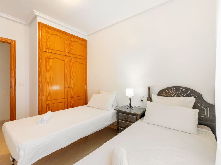 Guardamar del Segura: Large, cosy, comfortable apartment block "Edificio Las Americas". In the resort 500 m from the centre of Guardamar del Segura, in a quiet position, 650 m from the sea, 600 m from the beach. In the house: lift. Supermarket, restaurant 300 m, bus stop "Guardamar – Restautant Xinés" 600 m, railway station "Orihuela" 28 km, sandy beach "playa de Guardamar del Segura" 600 m."Edificio Las Americas", 4-room apartment 80 m2. Spacious and bright, comfortable and cosy furnishings: living/dining room 20 m2 with dining table, digital TV, flat screen, DVD, air conditioning and forced-air heating. Exit to the terrace. 1 room 12 m2 with 1 double bed (135 cm, length 190 cm), bath/bidet/WC. 1 room 9 m2 with 2 beds (80 cm, length 190 cm). 1 room 9 m2 with 2 beds (80 cm, length 190 cm). Kitchen (oven, 4 ceramic glass hob hotplates, microwave, electric coffee machine) with hatch. Shower/bidet/WC. Boiler (50 litres). Large terrace. Terrace furniture. Facilities: washing machine. Please note: apartment street side. Non-smokers only. TV only ES. VT-441601A // Reg. Nr.: ESFCTU000003057000489769000000000000000000VT-441601A0