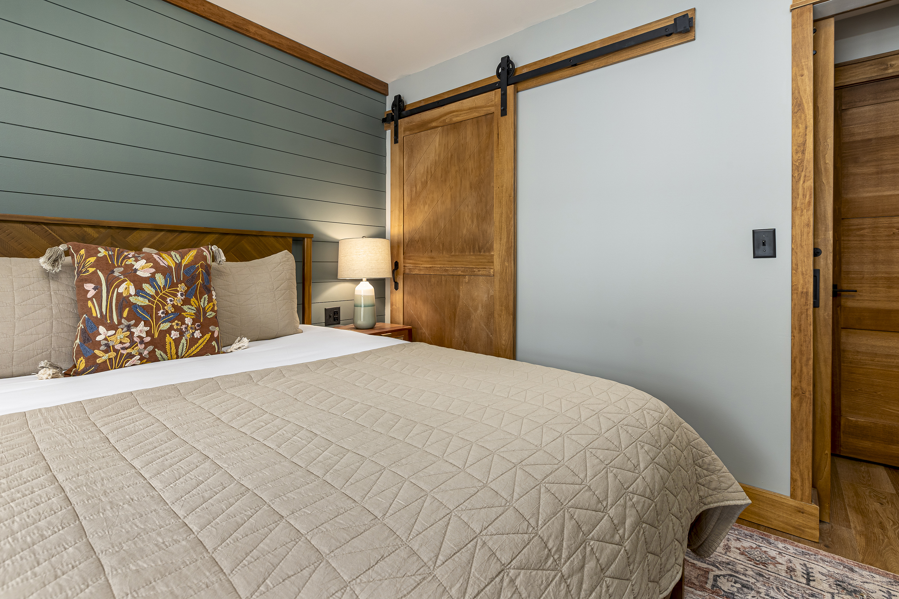 Step inside to an open-plan living area, where you can relax by the cozy electric fireplace or stream your favorites on the Smart TV. The space includes a fully-equipped kitchen and dining area, a tranquil bedroom with a plush king-size bed, and a comfortable queen sleeper sofa in the living room, accommodating up to 4 guests. The modern bathroom features a walk-in shower, and a dedicated workspace is available if you need to connect.