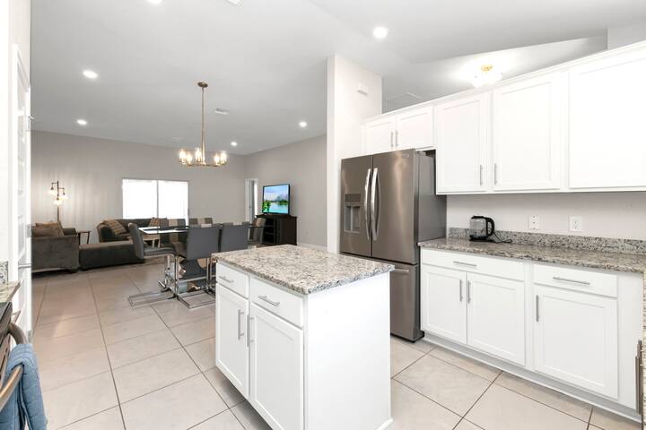 Welcome into the kitchen area, your culinary haven equipped for any mealtime adventure. With new white cabinets and marble countertops, it's the perfect backdrop for creating culinary delights. Explore the array of appliances at your disposal, from the cooker to the coffee maker, catering to every craving and culinary whim.