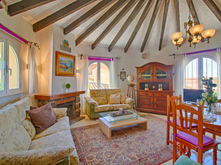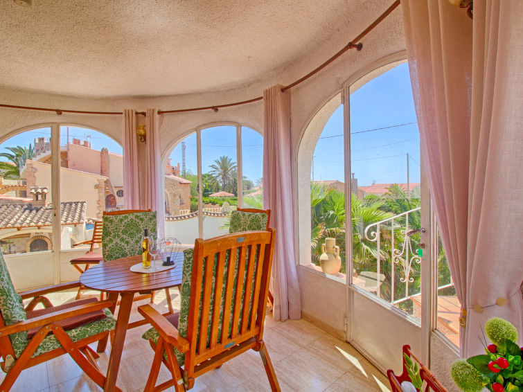 Puerto Blanco: Villa "Estrella". In the district of Canuta Baja 1.5 km from the centre of Calpe, 60 km from the centre of Alicante, 120 km from the centre of Valencia, 300 m from the sea. Private: property 650 m2 (fenced) with wildlife garden and trees, swimming pool kidney shaped (8 x 4 m, seasonal availability: 01.Jun. - 30.Sep.). Garden furniture, barbecue. Stepped path (11 steps) to the house. Parking (for 2 cars) on the premises. Shop 1.3 km, supermarket 1.3 km, restaurant 300 m, bus stop 1.4 km, sandy beach "Playa Puerto Blanco" 300 m. Nearby attractions: Parque atracciones Terra Mítica 35 km, Parque acuático Aqualandia 25 km. Hiking paths: Parque natural Peñon de Ifach 4.5 km. Please note: car recommended. Part of the house is closed and unoccupied. Access to the balcony via external staircase."Estrella", 3-room house 120 m2 on 1st floor. Object suitable for 4 adults. Practical furnishings: living/dining room with dining table, air conditioning and forced-air heating. Exit to the terrace. 1 room with 1 double bed (2 x 90 cm, length 190 cm). 1 room with 3 beds. Open kitchen (4 gas rings, toaster, kettle, microwave, freezer, electric coffee machine). Bath/WC, shower/WC. Balcony, terrace roofed. Terrace furniture, barbecue, deck chairs (2). Facilities: washing machine, iron, children's high chair, baby cot. Internet (WiFi, free). Parking (roofed, 1 car). Please note: non-smoking house. Maximum 2 pets/ dogs allowed. No internal connecting door between the floors. AT-445613-A // Reg. Nr.: ESFCTU00000302900026364900000000000000000AT-445613-A1