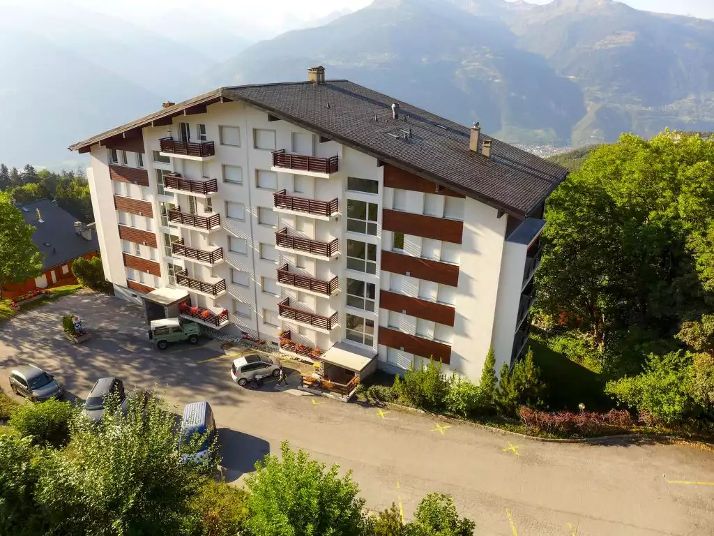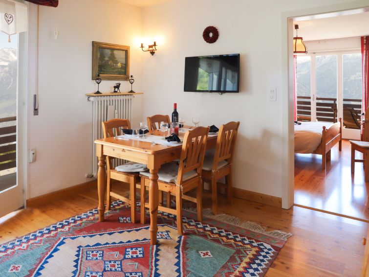Apartment house "Europa 2 Est / Ouest". Below Montana, in the district of Combaz, 1.4 km from the centre of Montana, in a quiet position, 2.1 km from the lake, 1.3 km from the skiing area, in a cul-de-sac, south facing position. In the house: lift, storage room for skis, central heating system. Parking (limited number of spaces) at the house, communal covered parking at the house at 80 m. Shop 1.4 km, supermarket 1.5 km, restaurant 1.4 km, bakery 700 m, bus stop "Comba" 400 m, railway station "Funiculaire Montana Gare" 1.3 km, bathing lake "Moubra" 2.4 km, lake Grenon 2.1 km. Golf course (18 hole) 3.6 km, skisport facilities 1.3 km, ice rink 2 km. Well-known lakes can easily be reached: Lac de la Moubra 2.4 km. Please note: ski bus (free of charge)."Europa Est 2 / APT 83", 3-room apartment 58 m2 on 3rd floor. Living/dining room with cable TV. Exit to the balcony, east facing position. 1 room with 1 french bed (160 cm, length 200 cm). Exit to the balcony, south facing position. 1 room with 1 x 2 bunk beds (90 cm, length 200 cm). Kitchen (4 hot plates, oven, toaster, kettle, electric coffee machine, Capsules for coffee machine (Nespresso) extra, raclette grill). Bathroom, sep. WC. Small balcony 7 m2, small balcony 4 m2. Balcony furniture. Very beautiful view of the mountains, the valley and the countryside. Facilities: hair dryer. Internet (WiFi, free). Garage space n E2 at 80 m, height 200 cm, width 220 cm. Please note: non-smokers only.