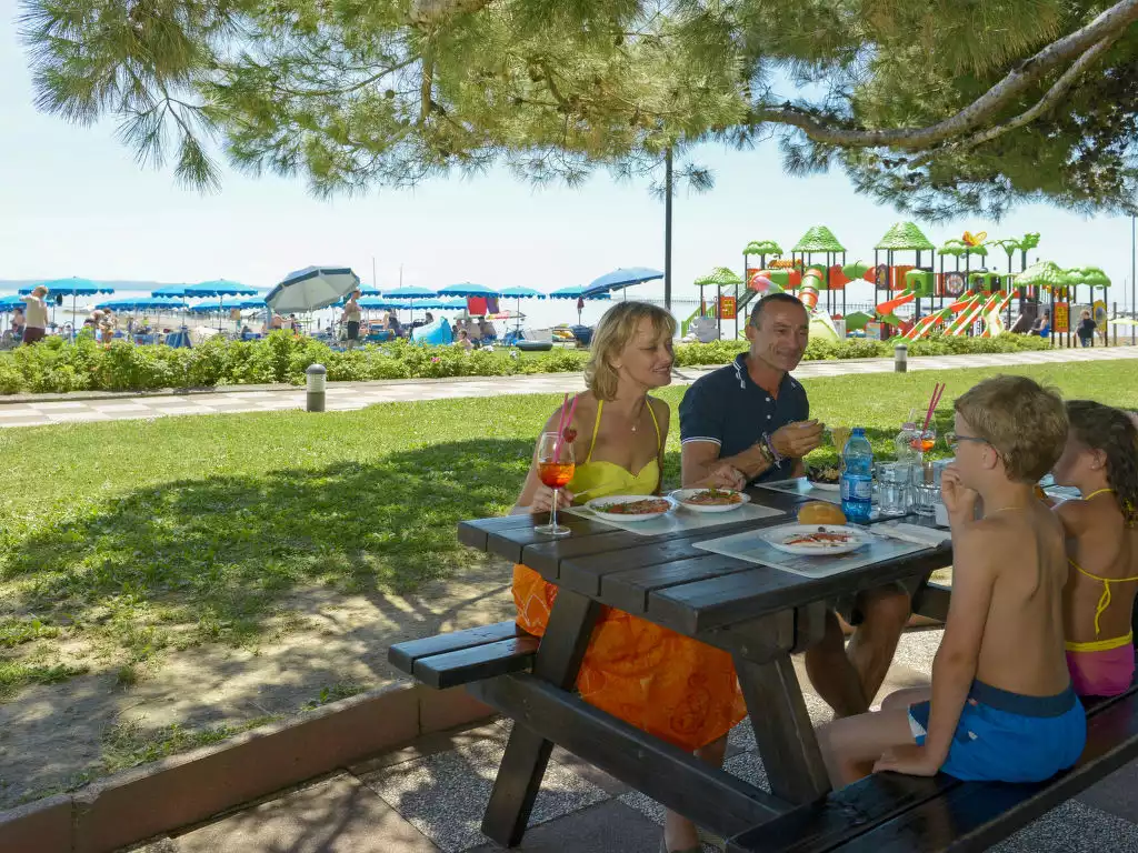 Grado: Very large, child friendly holiday village "Camping Europa 4*". 5 km from the centre of Grado, 50 km from the centre of Trieste, 130 km from the centre of Venezia, 20 m from the sea, direct access to the beach. For shared use: property 22 ha (fenced) with plants and trees, swimming pool (1'500 m2, seasonal availability: 23.Apr. - 27.Sep.). WC in the pool area, children's pool, slide, outdoor shower, tennis (1 x hard court), floodlit (extra), table tennis, beach volleyball, children's playground. In the complex: restaurant, bar, bistro, internet access, WiFi, shopping facilities, kiosk, washing machine, tumble dryer (for shared use, extra). Bus stop 500 m, railway station "Airport Station Trieste" 20 km. Nearby attractions: Castello di Duino 25 km, Riserva Naturale della Foce dell'Isonzo 14 km, Aquileia 16 km, Castello Miramare 40 km, Redipuglia 20 km, Collio 35 km. Please note: entertainment. Suitable for families. The electronic watch (included in the rental price) is the resort's exclusive means of payment and can be loaded online or in cash/by credit card during checkout hours. Beach service included (1 umbrella + 2 sunbeds per unit, for the whole season). Animation (whole season)."Exotic", 4-room mobile home 35 m2. Object suitable for 6 adults + 1 child. Entrance hall with veranda with dining table. 1 double bedroom. 1 room with 2 beds. 1 room with 2 beds and 1 x 1 bunk beds (65 cm, length 180 cm). Kitchen (3 hot plates, dishwasher, kettle, microwave, electric coffee machine). Shower/WC, sep. WC. Air-conditioning, forced-air heating. Terrace roofed. Deck chairs (2). Facilities: safe, mosquito net, children's high chair, baby cot (extra). Parking (1 car). Please note: non-smoking house. Beach ca. 80-260 m. IT031009B28ZDV3E5N
