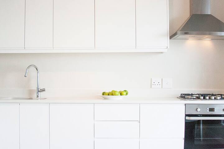 Open plan modern white kitchen with washing machine, dishwasher, gas hob (important for power failures), Nespresso coffee machine, air fryer, juicer, nutri bullet and stove. The kitchen/dining room has great views.