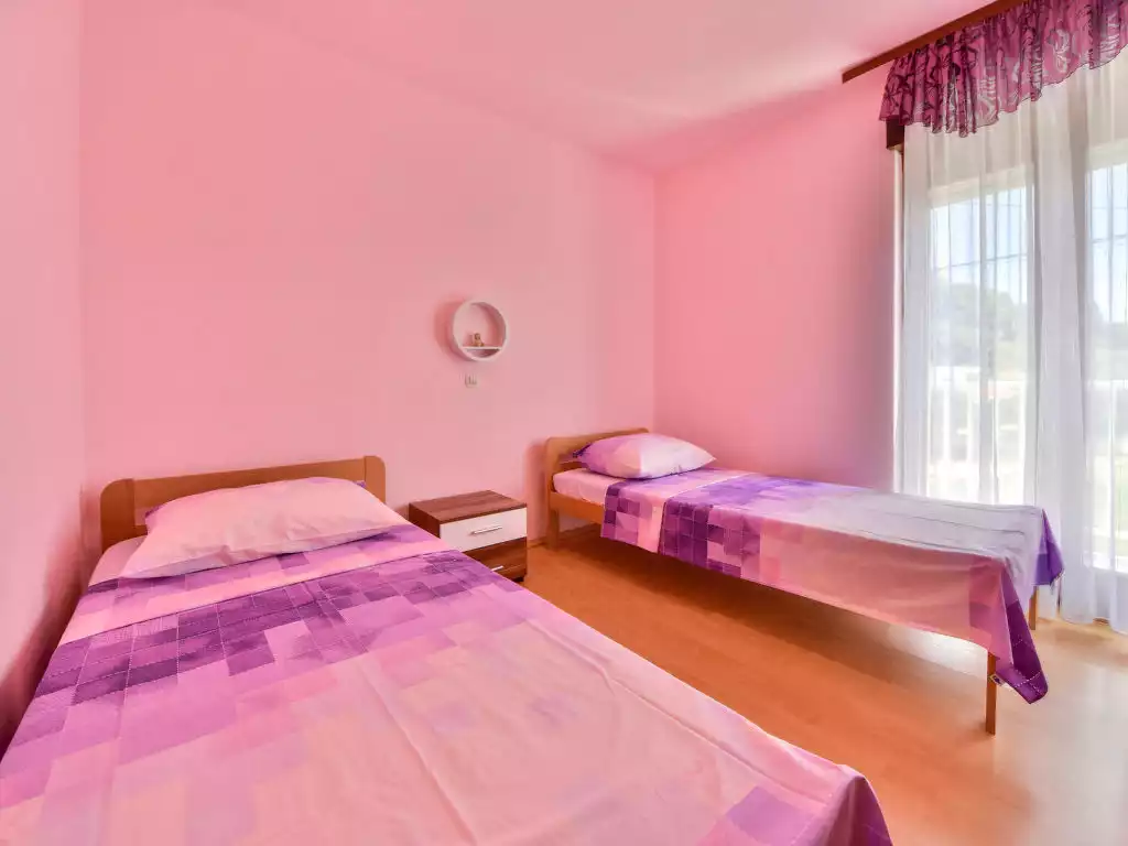 Apartment house "Fani". In the district of Banjol 1.2 km from the centre of Rab, in a quiet, sunny position, 300 m from the sea, 300 m from the beach, in the countryside. For shared use: property 550 m2. Barbecue. In the house: internet access. Parking at the house on the premises. Shop 280 m, restaurant 700 m, bus stop 1 km, sandy beach 300 m pebble beach 700 m, concrete beach 500 m. Marina 700 m.2-room apartment 49 m2 on 1st floor. 1 room 16 m2 with 1 double bed (2 x 90 cm, length 200 cm). Exit to the terrace. 1 room 10 m2 with 2 beds (90 cm, length 200 cm). Exit to the balcony. Dining room with satellite TV (flat screen), air conditioning. Exit to the terrace. Open kitchen (2 hot plates). Shower/WC. Balcony 6 m2, terrace 4 m2, roofed, terrace 17 m2 partly roofed. Terrace furniture. Facilities: Internet (WiFi, free). Please note: non-smoking house. 3126/XVII.