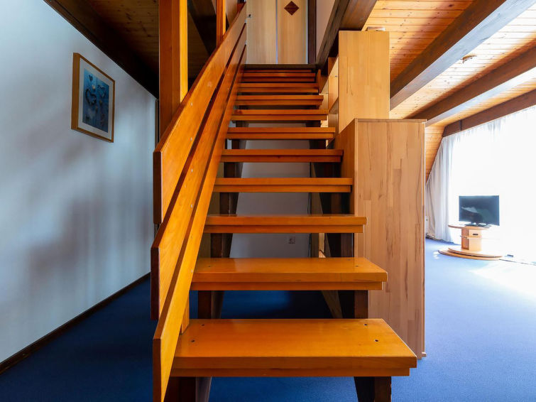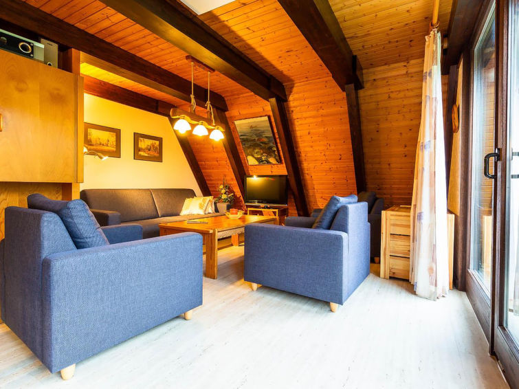 The spacious holiday park consists of multi-storey apartment buildings and wooden holiday homes, each with its own green space. In July/August, the municipality of Immenstaad offers a holiday program for children (extra). PLEASE NOTE: Cats are not allowed as pets. Child friendly resort "Ferienwohnpark Immenstaad", surrounded by meadows. On the outskirts, 2 km from the centre, 800 m from the lake. For shared use: children's playground. In the complex: reception, washing machine (extra), tumble dryer (for shared use, extra). Central parking spaces. Grocery 100 m, supermarket 100 m, restaurant 50 m, bus stop 50 m, railway station "Friedrichshafen" 7 km, outdoor swimming pool 4 km, indoor swimming pool 4 km, public bathing area 4 km. Nearby attractions: Abenteuerpark Immenstaad, Pfahlbauten Uhldingen, Zeppelinmuseum Friedrichshafen, Schloss Salem, Affenberg. Well-known lakes can easily be reached: Bodensee. Hiking paths: Bodenseegebiet. Please note: car-free holiday complex. The photograph shows a typical example. All houses/apartments are individually designed/furnished.3-room house 70 m2 on 2 levels. With sloping ceilings, simple and wooden furniture furnishings: living/dining room with satellite TV and radio. Exit to the garden, to the terrace. With sloping ceilings, open kitchen (4 hot plates, electric coffee machine). Shower/WC. Top floor: 1 room with sloping ceilings with 3 beds. 1 double bedroom with sloping ceilings. Electric heating. Terrace. Terrace furniture, box-room. Facilities: Internet (WiFi, free). Parking at 500 m. Please note: non-smoking house. Maximum 1 small pet/ dog allowed. Open kitchen, some with an oven. Nurdachhaus wood.