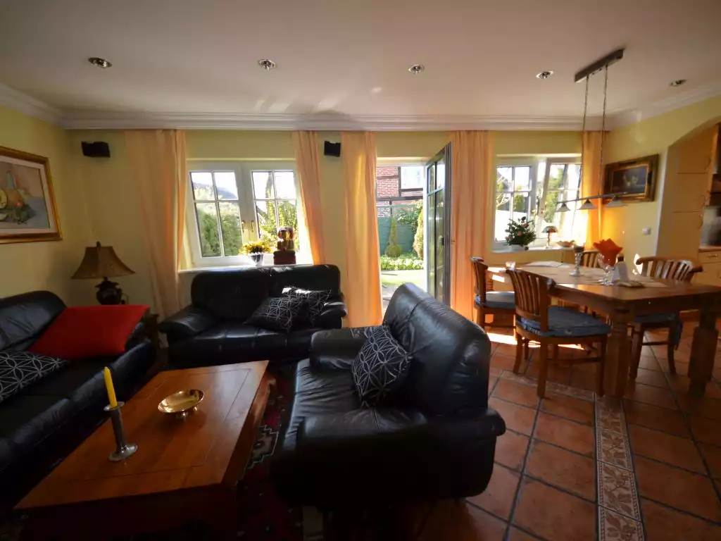 Terraced house. In the resort, 700 m from the sea, 2 km from the beach. In the house: central heating system. Parking at the house. Grocery, restaurant 200 m, bus stop 600 m, railway station 20 km, sandy beach 2 km, outdoor swimming pool 13 km, indoor swimming pool 13 km, swimming bay 2 km. Golf course (18 hole) 30 km, riding stable 5 km. The three reeded terraced houses and the pair of semi-detached houses behind them (DE9098.120.1 and DE9098.120.2) have a high-quality and perfectly matching interior. Each terraced house has a 109 cm (minimum) TV screen in the living/dining room and a second satellite TV (72 cm) in one of the bedrooms. Bicycles for hire."Fischerhaus", 3-room terraced house 67 m2 on 2 levels, on the ground floor. Living/dining room with satellite TV, video, CD-player and hi-fi system. Open kitchen (oven, dishwasher, microwave, electric coffee machine). Sep. WC. Upper floor: 2 double bedrooms with sloping ceilings. Shower/WC. Terrace, small garden. Terrace furniture. Facilities: washing machine, dryer, children's high chair. Internet (WiFi, free). Parking (1 car) at the house. Please note: non-smoking house. Maximum 1 pet/ dog allowed. Smoke alarm, fire extinguisher. One free parking space available. Additional parking spaces can be provided at a price of EUR 4.00 / day at a distance of 300 m, on request and after pre-order.