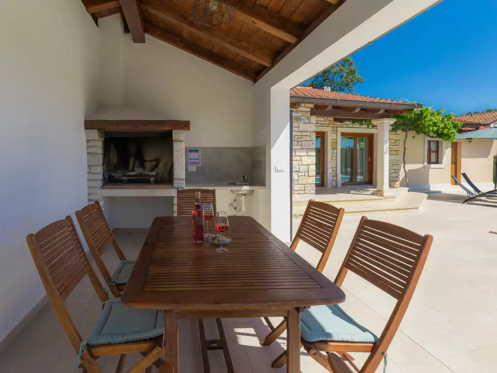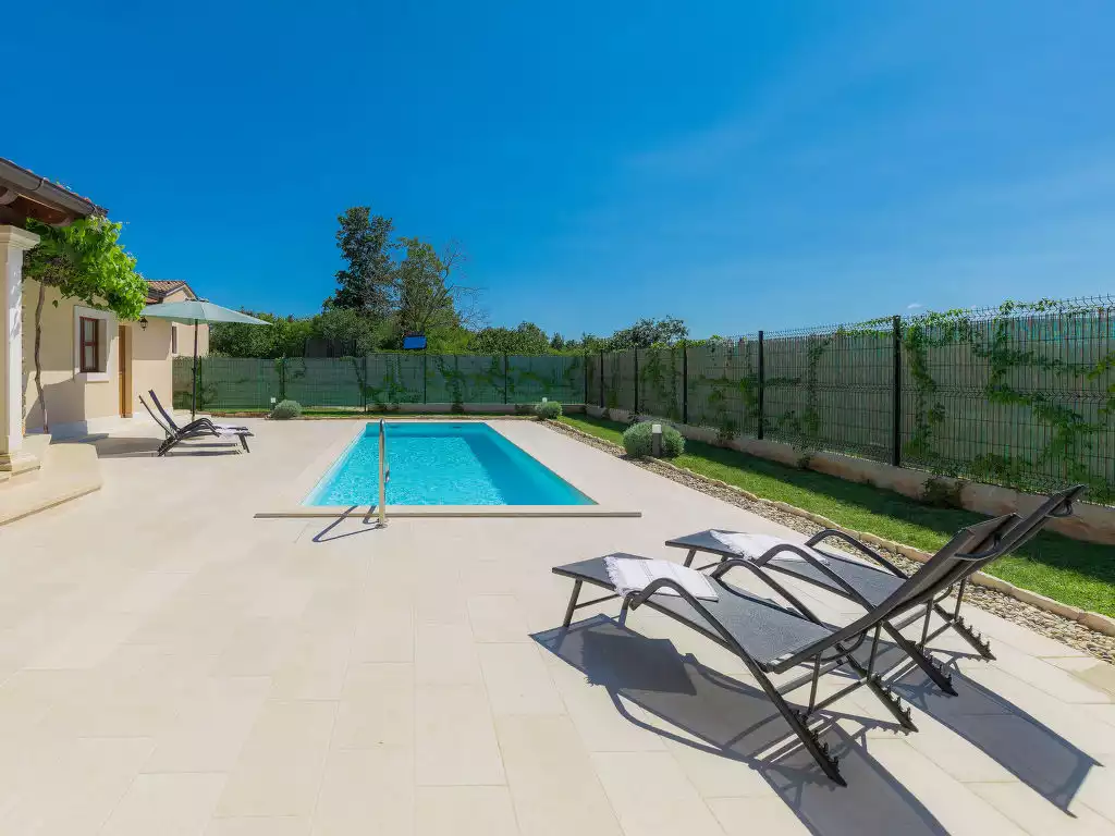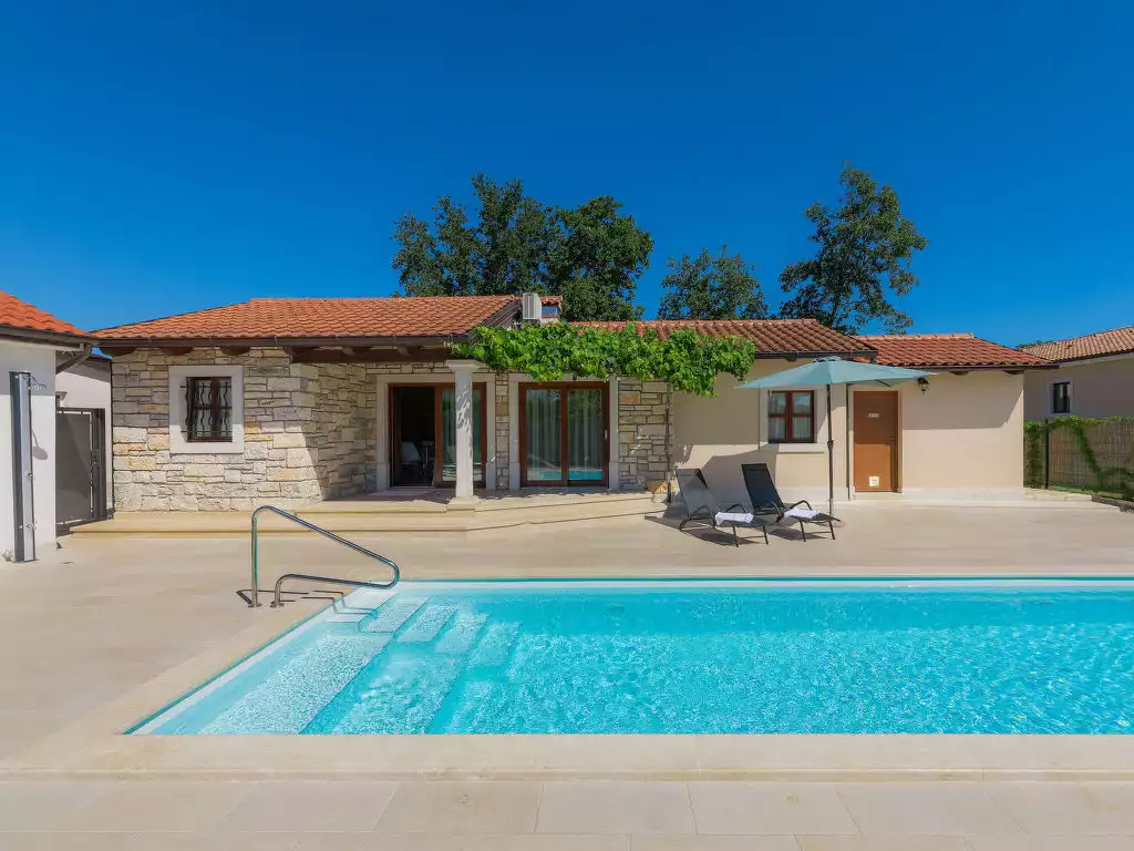Sveti Petar u Šumi 28 km from Rovinj: Single-family house "Florens". 300 m from the centre of Sveti Petar u Šumi, 7 km from the centre of Žminj, 28 km from the sea. Private: property 400 m2 (fenced), lawn and trees, swimming pool angular (9 x 3 m, seasonal availability: 01.May. - 01.Oct.) with internal staircase. Outdoor shower, terrace, garden furniture, barbecue. In the house: internet access, washing machine. Parking (for 2 cars) on the premises. Shop 500 m, supermarket 7 km, bus stop 6.6 km, pebble beach 28 km, rocky beach 28 km.3-room house 90 m2. Living/dining room with 1 double sofabed and satellite TV (flat screen), air conditioning. Exit to the terrace. 1 room with 1 french bed (160 cm). 1 room with 2 beds and shower/WC. Open kitchen (oven, dishwasher, 4 ceramic glass hob hotplates, toaster, kettle, microwave, freezer, electric coffee machine). Bath/bidet/WC. No heating option. Deck chairs. Facilities: iron, children's high chair, baby cot. Internet (WiFi, free). Please note: non-smoking house.