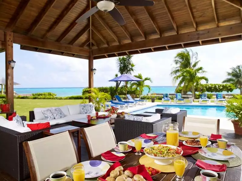 The dining room has large French windows on two sides (almost floor to ceiling) offering an uninterrupted view of seaside and garden views. Just beyond the villa is a covered seaside pavilion overlooking the sea, beach and the pool - great for morning coffee, afternoon relaxation or cocktails at Sunset ~
