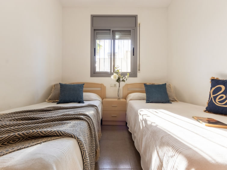 Riumar 10 km from Deltebre: Cosy, comfortable house "Gaviota 8", built in 2009. In a quiet, sunny position, 350 m from the sea, 350 m from the beach. Private: property (fenced), swimming pool angular (7 x 3 m, depth 1 - depth 90 cm, seasonal availability: 01.Mar. - 30.Nov.) with internal staircase. Pergola, terrace, garden furniture, barbecue. In the house: WiFi, air conditioning, washing machine. Parking at the house. Supermarket 850 m, restaurant, bar 300 m, bakery 850 m, bus stop "Riumar" 850 m, railway station "Aldea- Amposta" 25 km, sandy beach "Riumar" 300 m. Sports harbour 1 km. Nearby attractions: Parque natural Delta del Ebro 2 km, Tortosa 35 km, Playa el Trabucador 29 km, Barcelona 190 km, Port Aventura 70 km. Hiking paths: Ports Tortosa Beseit 52 km, GR 92 15 km. Please note: car recommended. Suitable for families. The photograph shows a typical example."Gaviota 8", 4-room house 89 m2, on the ground floor. Comfortable and cosy furnishings: living/dining room with dining table, digital TV, air conditioning and forced-air heating. Exit to the patio, to the swimming pool. 1 double bedroom with 1 french bed (135 cm, length 190 cm), shower/WC. 2 double bedrooms, each room with 2 beds (90 cm, length 190 cm). Kitchen (oven, 4 ceramic glass hob hotplates, toaster, microwave, freezer, electric coffee machine). Bath/bidet/WC. Air-conditioning, forced-air heating. Terrace furniture, barbecue, deck chairs (2), covered balcony. Facilities: washing machine, iron, mosquito net. Internet (WiFi, free). Parking (fenced) at the house. Suitable for families. Maximum 2 pets/ dogs allowed. HUTTE000926 // Reg. Nr.: ESFCTU0000430190006587650000000000000000HUTTE-0009260