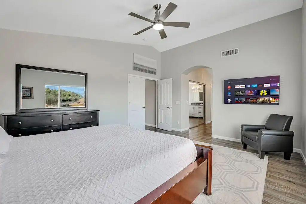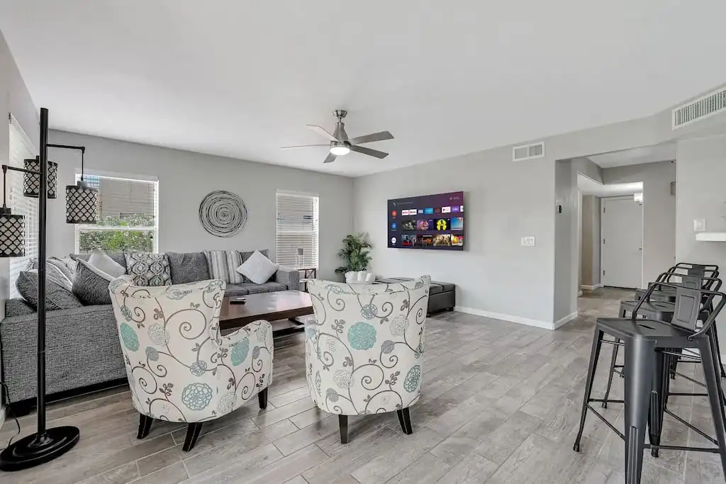 This fully renovated modern house has it all from the resort-style furnishings, large and spacious rooms with Smart TVs and wifi, the fully-furnished kitchen and huge backyard to enjoy a fire pit, BBQ, play corn hole, or just relax in two distinct seating areas allow you to both relax and entertain. However, if you just have to work, the dedicated office space/den is complete with desk and seating, office supplies and you can shut the doors for privacy on those videoconference meetings.