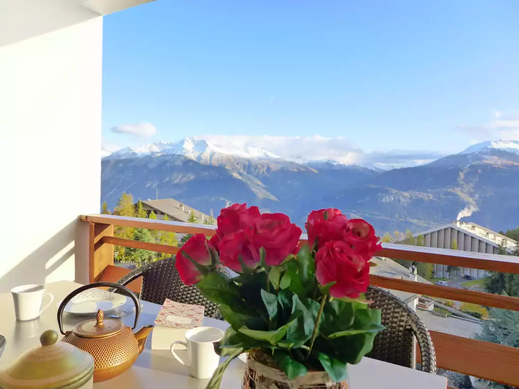 Apartment house "Grand Large A/B". In the resort 200 m from the centre of Montana, in a sunny position, 1.1 km from the lake, south facing position. In the house: lift, storage room for skis, central heating system, washing machine, tumble dryer (for shared use, extra), drying room. Parking (limited number of spaces). Shop 200 m, supermarket 240 m, restaurant, bakery 300 m, 2 minute walk to the centre, bus stop "Montana Poste" 100 m, railway station "Funiculaire Montana Gare" 210 m, bathing lake "Moubra" 1.7 km, lake Grenon 1.1 km. Golf course (18 hole) 2.2 km, skisport facilities 1 km. Well-known lakes can easily be reached: Lac de la Moubra 1.7 km, Etang Long 2.2 km. Please note: ski bus (free of charge). Floors are counted as levels (calculated from the bottom of the building)."Grand-Large A 22", 3-room apartment 74 m2 on 4th floor. Object suitable for 4 adults + 2 children. Renovated in 2017, beautiful furnishings: living/dining room with cable TV. Exit to the balcony. 1 room, south facing position with 1 double bed (2 x 90 cm, length 200 cm), shower/WC. Exit to the balcony. 1 room, north facing position with 1 x 2 bunk beds (90 cm, length 200 cm), 1 double bed (2 x 80 cm, length 200 cm). Open kitchen (oven, dishwasher, 3 induction hot plates, toaster, kettle, microwave, electric coffee machine, Capsules for coffee machine (NESPRESSO), raclette grill, fondue Set (cheese)). Bath/WC. Balcony, south facing position. Balcony furniture. Very beautiful view of the mountains. Facilities: iron, children's high chair, hair dryer. Internet (WiFi, free). Garage space n 18 at 15 m, height 175 cm, width 240 cm. Please note: non-smokers only.