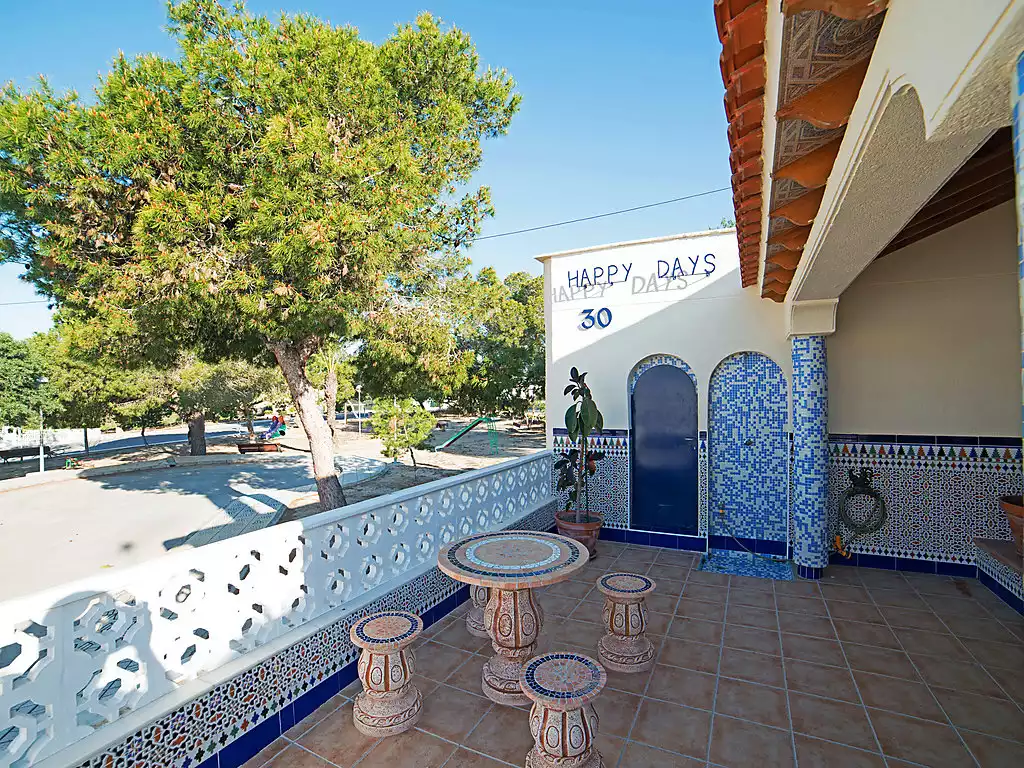 Urb. El Moncayo: Semi-detached house "Happy days". 3 km from the centre of Guardamar, 8 km from the centre of Torrevieja, 1.5 km from the sea, 1.5 km from the beach, in a cul-de-sac. Parking at the house. Supermarket 2 km, restaurant 2 km, bar 2 km, bus stop 200 m, sandy beach "Moncayo" 1.5 km. Golf course (18 hole) 10 km, tennis 50 m, children's playground 20 m. Please note: car recommended."Happy Day", 3-room semi-detached house 60 m2. Comfortable furnishings: living/dining room with 1 sofabed, open-hearth fireplace, dining table and satellite TV (flat screen), hi-fi system, air conditioning and forced-air heating. Exit to the terrace. 1 room 12 m2 with 1 double bed (135 cm, length 190 cm), air conditioning and forced-air heating. 1 room 12 m2 with 1 double bed (135 cm, length 190 cm), air conditioning and forced-air heating. Open kitchen (oven, 4 ceramic glass hob hotplates, microwave, electric coffee machine) with boiler (50 litres). Bath/bidet/WC. Electric heating. Terrace 20 m2 partly roofed. Terrace furniture. Facilities: washing machine. Internet (WiFi, free). Suitable for families. Maximum 1 small pet/ dog allowed. VT-441602A
