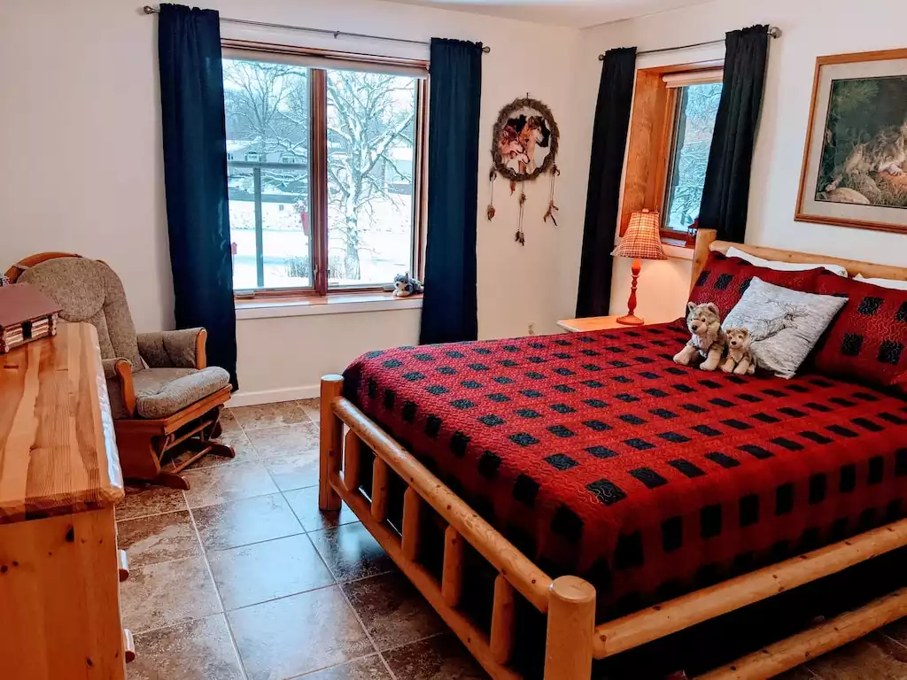 Queen Wolf bedroom: Queen bed and pack n play. Lower Level with views of the garden and lake.