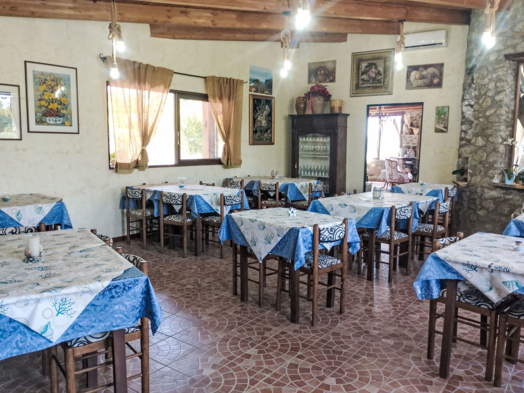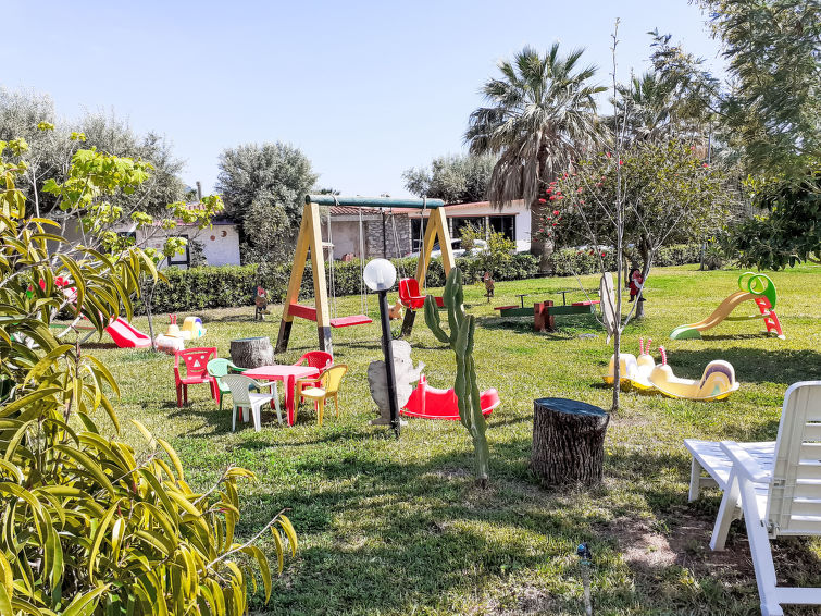 Santa Maria di Ricadi 8 km from Tropea: Small, child friendly, cosy holiday village "Heaven", surrounded by trees. In the district Santa Maria di Ricadi, in a sunny position, 550 m from the sea, 550 m from the beach. For shared use: well-kept garden plants and flowers, lawn for sunbathing, swimming pool (12 x 6 m, depth 90 - 150 cm, seasonal availability: 16.Apr. - 29.Oct. pool opening hours: 08:00-14:00 and 16:00-20:00). Outdoor shower, volleyball court, patio, garden furniture, barbecue, children's playground (slide, swing). In the complex: reception, restaurant, bar, WiFi, table football, sun terrace, washing machine (for shared use, extra). Linen change (suppl. charge extra). Towel change (suppl. charge extra). Breakfast and half board possible (extra). Airport transfer (extra). Parking on the premises. Shop, grocery, supermarket, restaurant, bar 500 m, 10 minute walk to the centre, bus stop 1 km, railway station "Ricadi" 5 km, sandy beach "Santa Maria di Ricadi" 550 m. Nearby attractions: Baia di Grotticelle 1 km, Tropea 8 km, Faro Capo Vaticano 3 km, Vibo Valentia 30 km, Reggio Calabria 90 km. Please note: suitable for families, baby equipment on request. Local sale of farm products. The photograph shows a typical example. Additional accommodations can be booked. The holiday properties may differ in situation, size and location. Included in the price: swimming pool, shuttle to/from the sea, parking, transfer to Ricadi station arrival/departure. The apartments are located on the ground or first floor and have a veranda or patio.3-room apartment 50 m2. Simple and practical furnishings: living/dining room with 1 sofabed and TV. 1 double bedroom with air conditioning and forced-air heating. 1 room with 2 beds. Kitchenette (4 hot plates, electric coffee machine). Shower/bidet/WC. Balcony or patio. Balcony furniture. Parking space n 1. Suitable for families. 1 small pet/ dog allowed. IT102030A1R496VAFX