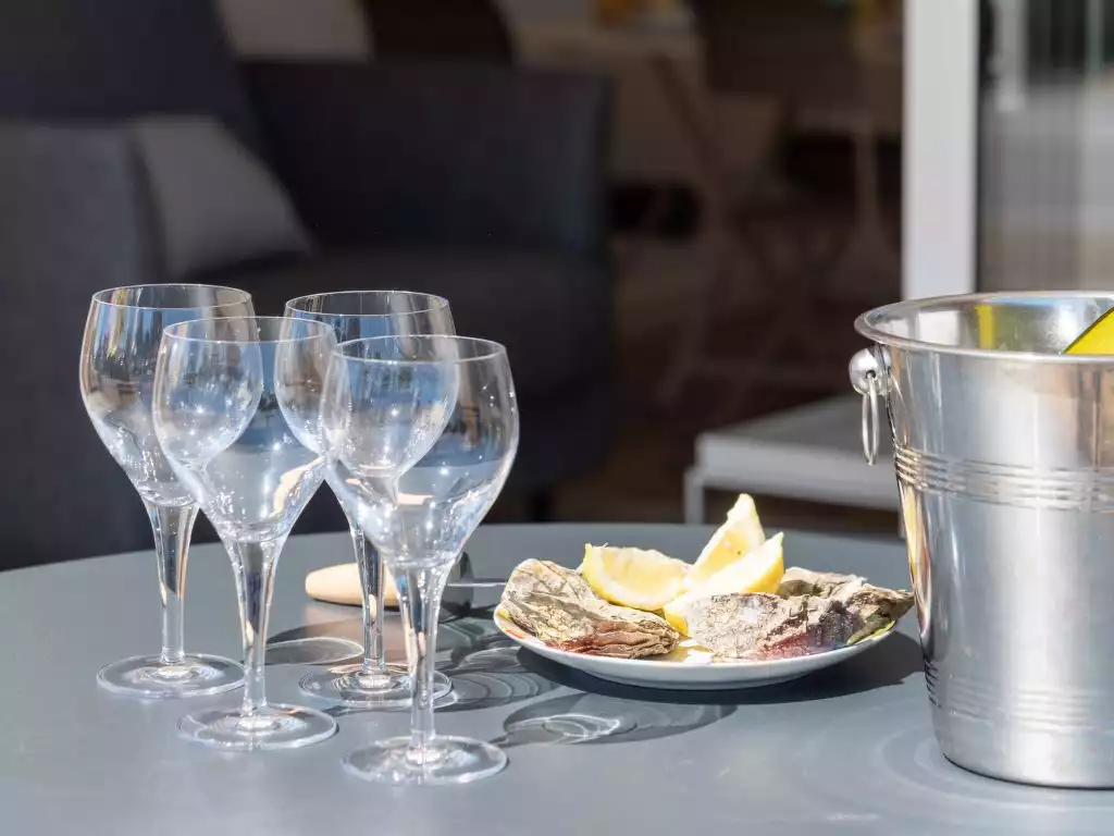 Modern, comfortable apartment block "Hemisphère", 2 storeys, built in 2022. 1.2 km from the sea, 1.2 km from the beach. Shop 500 m, supermarket, bakery 500 m, sandy beach "Grande Plage de Carnac" 1.2 km, park "Cézarine" 50 m, thermal baths "Thalassothérapie Thalazur" 2 km. Golf course (18 hole) 15 km, surf school 6 km, sailing school 2 km. Nearby attractions: Les Alignements de Carnac 5 km, La Trinité sur Mer 5 km, Presqu'ile de Quiberon 15 km, Vannes 30 km, Lorient 45 km, Belle Ile en Mer, Houat, Hoedic. Hiking paths: Le Golfe du Morbihan 30 km. Walking market (250m) on Wednesday and Sunday.2-room apartment 48 m2, on the ground floor, south facing position. Spacious, very comfortable and modern furnishings: living/dining room with 1 sofabed (80 cm, length 190 cm), TV (flat screen). Exit to the terrace, to the patio. 1 room with 2 beds (90 cm, length 200 cm). Open kitchen (oven, dishwasher, 3 induction hot plates, toaster, kettle, electric coffee machine, Capsules for coffee machine (NESPRESSO) extra). Shower, sep. WC. Terrace 10 m2, patio 15 m2, south facing position. Terrace furniture. Facilities: washing machine, hair dryer. Internet (WiFi, free). Parking space n 5. Please note: smoke alarm. 5603400072770