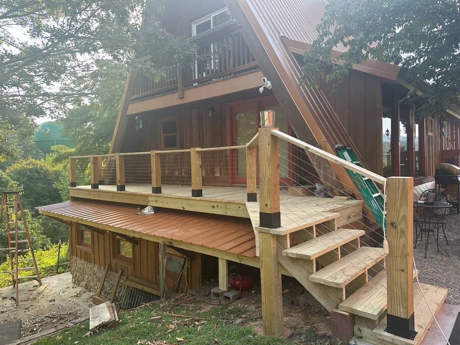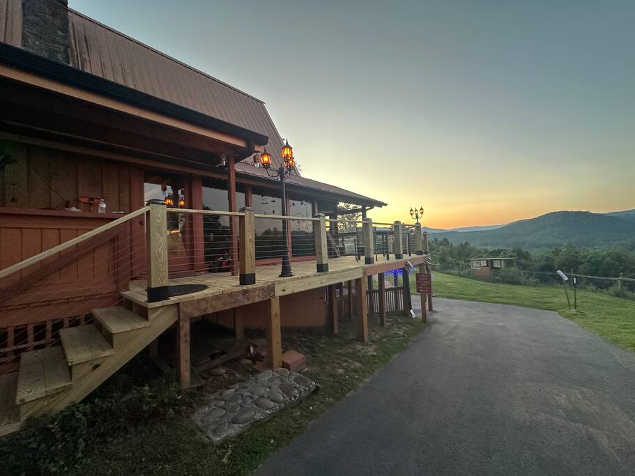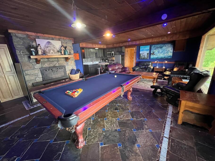 Beautiful Old A frame overlooking Helen, Mountain Views. 4 bedroom, 3 bath, 2 new custom kitchens, living rooms. Huge tvs - lots of decks, baby goats. 2 King Vibrating Beds. 9 total beds and Smart tvs. lower level set up like a pub. 9 foot pool table, kitchen, fireplace. Also best hot tub you've ever been in. Hot tub shared.