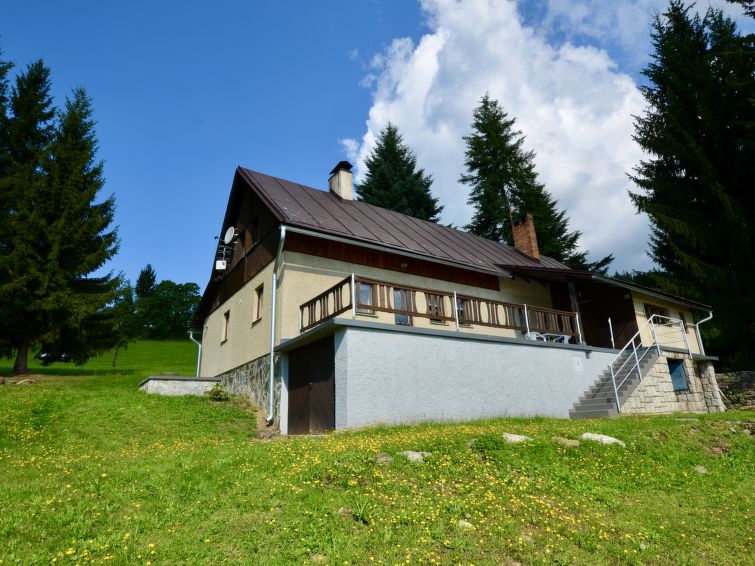 Vítkovice 8 km from Benecko: Cosy cottage "Hoja", surrounded by trees and meadows. 2 apartments in the property. On the outskirts, 100 m from the edge of the forest, 900 m from the skiing area, in a cul-de-sac, in the countryside. For shared use: property, lawn for sunbathing. Terrace, garden furniture. In the house: WiFi. Public parking 800 m. Grocery 2 km, restaurant 1 km, bus stop "Vítkovice, kostel" 1.3 km, railway station "Víchová nad Jizerou" 10 km, outdoor swimming pool 8 km, indoor swimming pool 11 km. Golf course (9 hole) 26 km, riding stable 5 km, walking paths from the house, cycle lane 50 m, ski lift 1 km, chair lift 1 km, ski rental 1 km, ski school 1 km, cross country ski track 200 m, children's playground 2 km. Nearby attractions: Bikepark Aldrov 1,5 km, Farma Hucul 5 km, Rautis Poniklá - perličkové ozdoby 7 km, Zámek Jilemnice, Rokytnice nad Jizerou 11 km, Zámek Vrchlabí 17 km, Harrachov 24 km, Špindlerův Mlýn 30 km, Pec pod Sněžkou 45 km. Well-known ski regions can easily be reached: Vurmovka, Aldrov 1 km, Janova Hora 2 km, Rokytnice n. J. 10 km, Benecko 15 km, Herlíkovice 20 km, Špindlerův Mlýn 30 km. Hiking paths: Krkonošský národní park. Please note: Loading and unloading of baggage is possible at the holiday house. The photograph shows a typical example."Hoja 1", 3-room semi-detached house on 2 levels. Spacious, comfortable furnishings: living/dining room with open-hearth fireplace, dining table, TV and heating stove. 1 double bedroom with electric heater. Kitchen (2 ceramic glass hob hotplates, kettle, microwave, electric coffee machine). Shower, sep. WC. Wood heating. Upper floor: 1 room with 2 double beds and electric heater. Very beautiful panoramic view of the countryside. Suitable for families. Maximum 1 pet/ dog allowed.