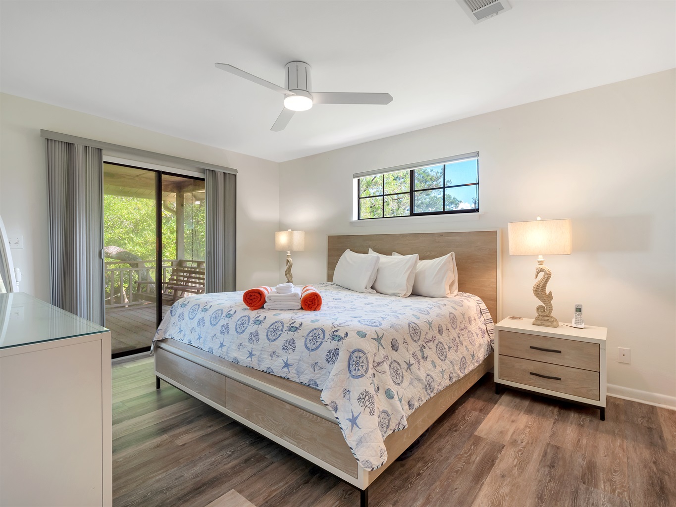 The well-appointed kitchen has everything needed to prepare coastal feasts and features beautiful white custom cabinetry, quartz counters, and stainless appliances. There is plenty of room at mealtime at the large dining table and kitchen counter stools. A pub table with stools on the screen porch is the perfect place for al fresco dining.