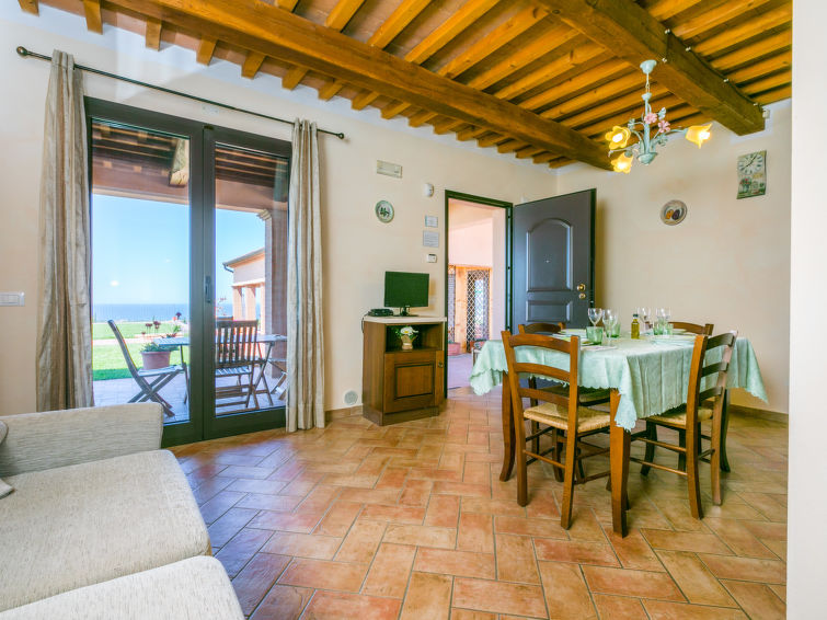 Very beautiful residence "Il Corbezzolo", surrounded by meadows and fields. 6 houses in the residence. 3 km from the centre of San Vincenzo, 60 km from the centre of Livorno, 35 km from the centre of Cecina, in a quiet, elevated position, 3 km from the sea. For shared use: beautiful, well-kept garden (fenced), swimming pool (11 x 8 m, seasonal availability: 22.May. - 27.Sep.). Outdoor shower. In the house: washing machine (extra) (for shared use). Parking on the premises. Shop 3 km, restaurant 100 m, sandy beach 3 km. Marina 3 km. Local sale of farm products. Please note: the owner lives on the same property.2-room terraced house 45 m2. Rustic and tasteful furnishings: living/sleeping room with 1 double sofabed, dining table and satellite TV. Exit to the loggia. 1 double bedroom. Open kitchen (oven, 4 gas rings, electric coffee machine). Shower/bidet/WC. Gas heating (extra), air-conditioning (extra). Terrace furniture, covered balcony. Marvellous panoramic view of the sea. Facilities: safe, baby cot. Internet (WiFi, free). IT049018B5E2AETKNN