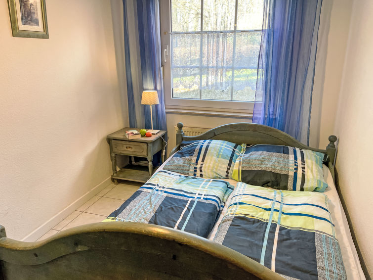Residence "Im Dörp, Am Bodden, Jollekieker". 300 m from the centre of Waase, on the outskirts, 6 km from the centre of Gingst, 20 km from the centre of Bergen auf Rügen, 300 m from the sea. For shared use: property 3'500 m2 with lawn and plants. Supermarket 6 km, restaurant 6 km, bus stop "Gemeindehaus Waase" 400 m, sandy beach "Schaabe" 35 km, grass beach 400 m, indoor swimming pool 35 km. Nearby attractions: Wassersportzentrum Suhrendorf 3 km. The residence consists of 4 identical, maximum two-storey houses. Covered bicycle parking available."Wohnung Nr.9 im Dörp", 3-room apartment 70 m2, on the ground floor. Beautiful and modern furnishings: living/sleeping room with 1 sofabed, dining table, satellite TV, radio and CD-player. Exit to the terrace. 1 double bedroom. 1 room with 1 french bed. Open kitchen (oven, dishwasher, 4 ceramic glass hob hotplates, toaster, kettle, microwave, electric coffee machine). Shower/WC. Gas heating. Terrace. Terrace furniture, box-room. Facilities: washing machine, children's high chair, baby cot. Internet (WiFi, free). Parking (1 car). Please note: non-smokers only. Smoke alarm. DE05988