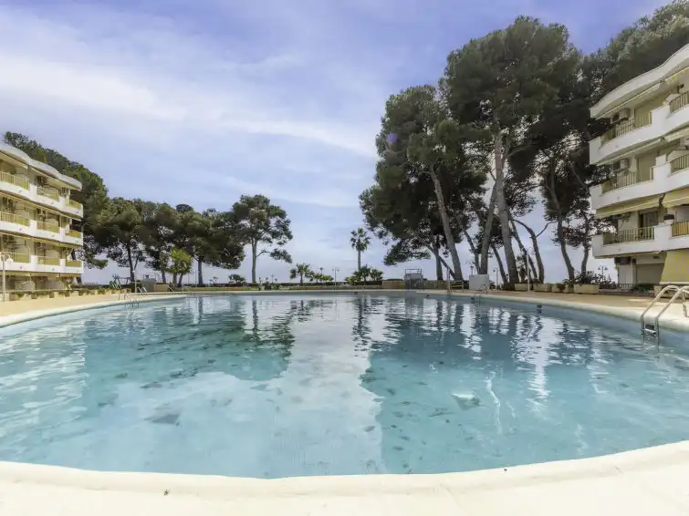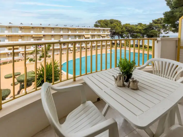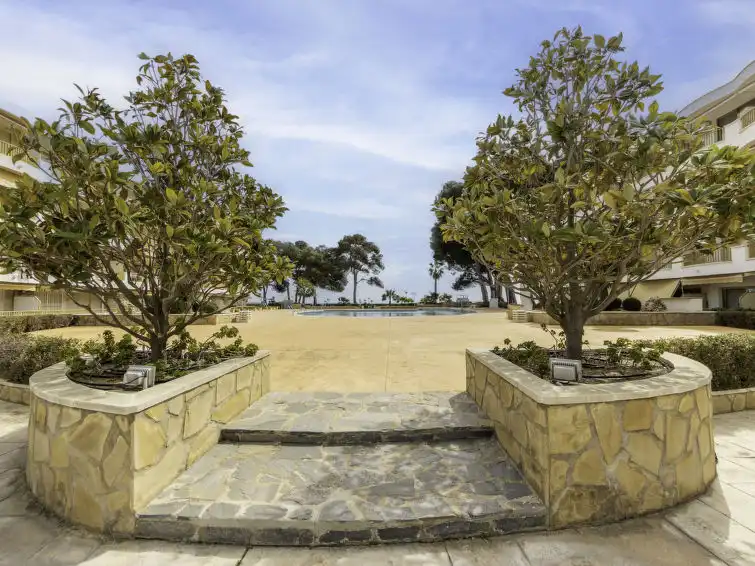 Vilafortuny: Beautiful, cosy, comfortable apartment block "International", 3 storeys. In a sunny position, 20 m from the sea, from the beach. For shared use: swimming pool (10 x 20 m, depth 80 - 200 cm, seasonal availability: 15.Jun. - 15.Sep.). In the house: lift. Bus stop 150 m, sandy beach 20 m. Golf course (18 hole) 3 km. Nearby attractions: Parque temático PORTAVENTURA 2 km, Parque aquático AQUOPOLIS 5 km, Spa AQUUM 5 km, Karting 2 km, Paintball 8 km."International", 1-room studio 34 m2 on 3rd floor. Practical and beautiful furnishings: living/sleeping room with 2 beds (90 cm, length 190 cm), 1 sofabed (135 cm, length 190 cm), digital TV. Exit to the terrace. Open kitchen (2 ceramic glass hob hotplates, toaster, microwave, electric coffee machine). Shower/WC. No heating option. Terrace. Terrace furniture. View of the sea. Facilities: washing machine, iron, hair dryer. HUTT-049467