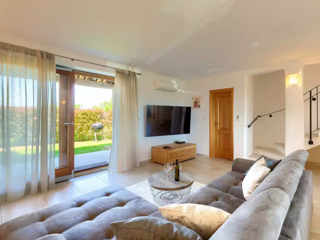 Beautiful terraced house. In the hamlet Baredine 4 km from the centre of Buje, in a quiet, sunny, elevated position, 17 km from the sea. For shared use: property 500 m2, garden, swimming pool angular (11 x 8 m, depth 100 - 150 cm, seasonal availability: 15.May. - 15.Sep.) with internal staircase. Outdoor shower, barbecue. In the house: internet access. Parking at the house on the premises. Shop 4 km, restaurant 1 km, bus stop 4 km, railway station 33 km, pebble beach 17 km. Tennis 16 km, sports centre 16 km, walking paths from the house 1 km, cycle lane 1 km. Nearby attractions: Aquapark 19 km."Istriana", 4-room terraced house 145 m2 on 3 levels. Beautiful and cosy furnishings: living/dining room 45 m2 with satellite TV (flat screen), DVD and air conditioning. Exit to the garden, to the terrace. Open kitchen (oven, dishwasher, 4 ceramic glass hob hotplates, microwave, freezer, electric coffee machine). Exit to the terrace. Sep. WC. Upper floor: 1 room with Dressing room with 2 beds (90 cm, length 200 cm), bath/WC and air conditioning. 1 room with 1 french bed (160 cm, length 200 cm), shower/WC and air conditioning. 2nd upper floor: 1 room 25 m2 with 1 french bed (160 cm, length 200 cm), bath/bidet/WC and air conditioning. Exit to the terrace. Floor heating. Terrace 10 m2, roofed, terrace 15 m2 partly roofed, garden 20 m2, lawn. Terrace furniture, barbecue (portable), deck chairs. Marvellous view of the countryside. Facilities: washing machine. Internet (WiFi, free). Terrace 20 m2.