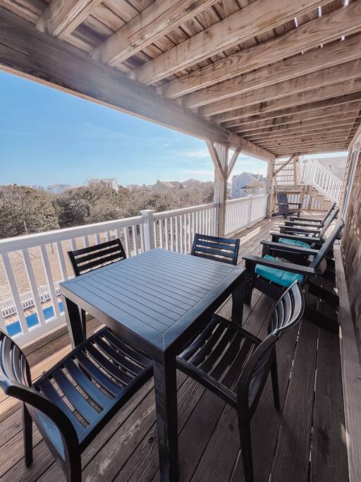 Lounge in the sun or shade on one of our many decks, where you can enjoy your morning coffee, read a good book, or sip your favorite adult beverage. Your favorite deck will soon be the Crow’s Nest which offers not only ocean views (partial), but views of Corolla for miles!