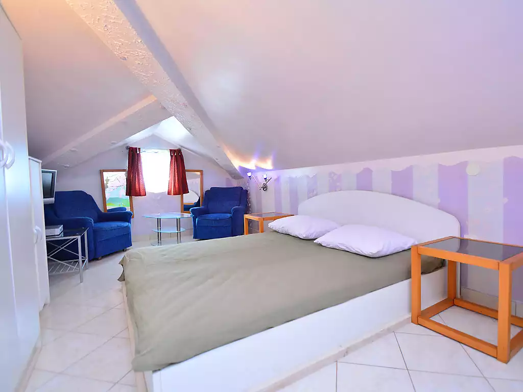 Apartment house "Ivana". 4 km from the centre of Zaton, 11 km from the centre of Šibenik, in a quiet, sunny position, 5 km from the sea, on the lake. For shared use: outdoor shower, arbour, garden furniture, barbecue. In the house: internet access. Parking at the house on the premises. Shop, restaurant 100 m, bus stop 800 m, pebble beach 7 km, bathing lake 10 m. Nearby attractions: NP Krka 24 km. Please note: private mooring (extra) on request.3-room apartment 60 m2 on 2nd floor, east facing position. Living/dining room with 1 sofabed (150 cm, length 190 cm). Exit to the balcony. 1 room with sloping ceilings, ceiling height 120 - 210 cm with rooflight with 1 french bed (160 cm, length 200 cm), satellite TV (flat screen). 1 room with sloping ceilings, ceiling height 120 - 210 cm with rooflight with 2 beds (90 cm, length 200 cm). Kitchen (2 hot plates, microwave, electric coffee machine) with satellite TV (flat screen), air conditioning. Bath/WC. Air-conditioning (extra). No heating option. Balcony 5 m2. Balcony furniture. Marvellous view of the lake. Facilities: Internet (WiFi, free). Maximum 1 pet/ dog allowed.
