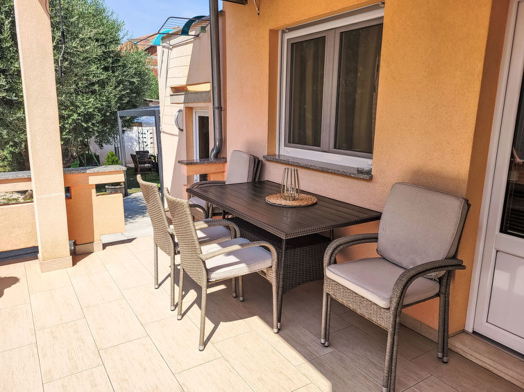 3-family house "Ive", 2 storeys. 500 m from the centre of Petrčane, in a sunny position, 350 m from the sea, 350 m from the beach, located by a road. For shared use: property 1'000 m2 (fenced), lawn. Garden furniture, barbecue. In the house: internet access, washing machine. Parking (for 4 cars) at the house on the premises. Shop 550 m, restaurant 350 m, bus stop 7.2 km, pebble beach 350 m. Nearby attractions: Aquapark 5 km. The house consists of 3 apartments rented as one unit. Two apartments on the ground floor and one apartment on the first floor. Pets are not allowed.6-room house 130 m2 on 2 levels, south facing position. Living/dining room 20 m2 with kitchen corner and satellite TV (flat screen), air conditioning. Exit to the terrace. 1 room with 1 double bed (2 x 90 cm, length 200 cm). 1 room with 1 french bed (160 cm, length 200 cm), satellite TV (flat screen), air conditioning. Exit to the terrace. Kitchen (2 hot plates, dishwasher, freezer) with dining table. Shower, shower/WC, sep. WC. Upper floor: living/dining room 20 m2 with satellite TV (flat screen), air conditioning. Exit to the terrace. 1 room with 1 french bed (160 cm, length 200 cm). 1 room with 2 beds (90 cm, length 200 cm). Open kitchen (oven, 2 ceramic glass hob hotplates, freezer). Bath/WC. No heating option. 2 terraces 6 m2, covered, terrace 10 m2. Terrace furniture. Partial view of the sea. Facilities: hair dryer. Internet (WiFi, free). On the ground floor:one apartment with living/dining area, open kitchen and 1 bedroom, the second apartment with 1 bedroom and kitchen. On the first floor:apartment with living/dining area, open kitchen and 2 bedrooms.