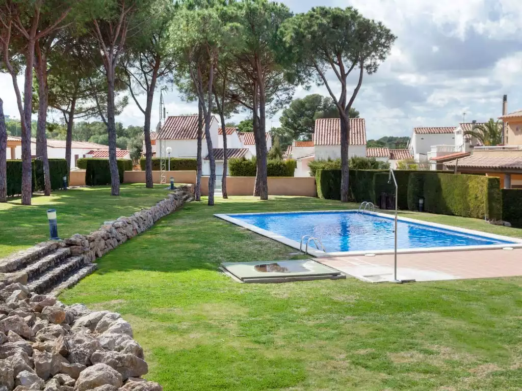 Urb. PINAMAR: Single-family house "Juanes", 2 storeys. On the outskirts, 3 km from the centre of L'ESCALA, in a quiet, sunny position, 1.5 km from the sea, 1.5 km from the beach. For shared use: large, well-kept garden with lawn, swimming pool (seasonal availability: 01.Apr. - 31.Oct.). Barbecue. Private: well-kept garden with lawn. Stepped path (4 steps) to the house. Supermarket 1.4 km, restaurant 1.4 km, internet café 2.4 km, bicycle rental 1.2 km, bus stop 4.7 km, sandy beach "Riells" 1.5 km, diving center 1.4 km. Sports harbour 1.4 km, surf school 1.5 km, sailing school 1.5 km, riding stable 5.2 km. Nearby attractions: Ruinas greco-romanas d'Empùries 4.6 km, Museo Dalí de Figueres 26 km, Parque acuatico AQUABRAVA de Roses 27 km, Skydive Empuriabrava 23 km, Casino-Festival de Perelada 30 km, Pitch and Putt de Gualta 15 km. Please note: Additional accommodations can be booked. Property ref. ES9425.675.3 is situated on the same property. The swimming pool is shared between 13 houses.4-room terraced house 74 m2. Living/dining room with digital TV and flat screen. Exit to the terrace, to the swimming pool. 1 room with 1 x 2 bunk beds. Open kitchen (4 hot plates, oven, microwave, freezer). Shower/WC. Upper floor: 1 room with 1 pull-out bed (2 pers.). 1 room with 1 french bed. Exit to the terrace. Bath/bidet/WC. Terrace furniture. View of the swimming pool and the garden. Facilities: washing machine. Please note: TV only ES. HUTG004625 // Reg. Nr.: ESFCTU00001701000034293200000000000000HUTG-004625-584