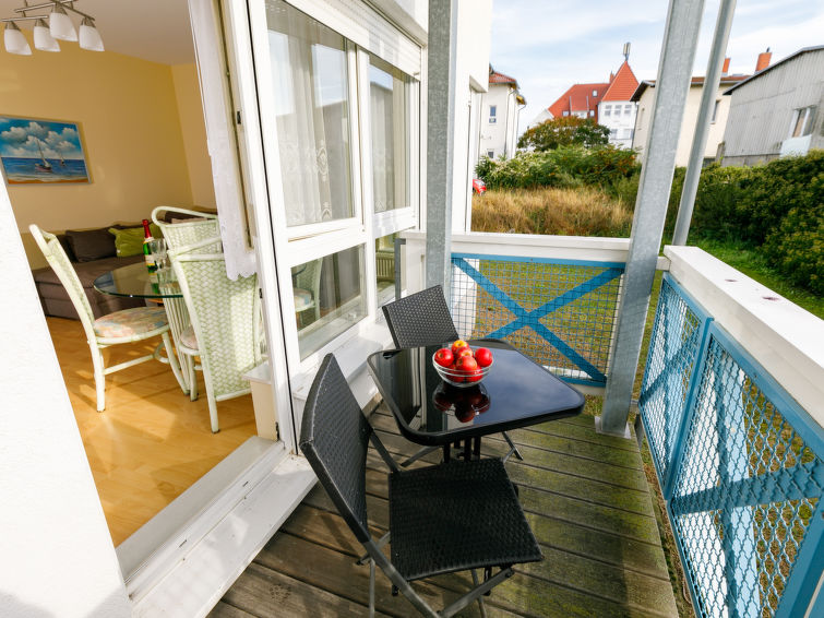 Apartment block, 2 storeys. In the resort 750 m from the centre of Koserow, 900 m from the sea, 900 m from the beach. In the house: central heating system. Parking on the premises. Supermarket 1 km, restaurant 200 m, bakery, café 150 m, bus stop 900 m, railway station 1.3 km, sandy beach 900 m, thermal baths "Bernsteintherme" 9 km. Golf course (18 hole) 18 km, surf school 9 km, minigolf 600 m."Kalisch", 2-room apartment 62 m2, on the ground floor. Cosy furnishings: living/dining room with 1 sofabed and cable TV (flat screen), radio. Exit to the terrace. 1 room with 1 double bed. Kitchen (oven, toaster, kettle, electric coffee machine). Bath/WC. Terrace. Terrace furniture. Facilities: children's high chair, baby cot. Please note: non-smokers only. Smoke alarm.