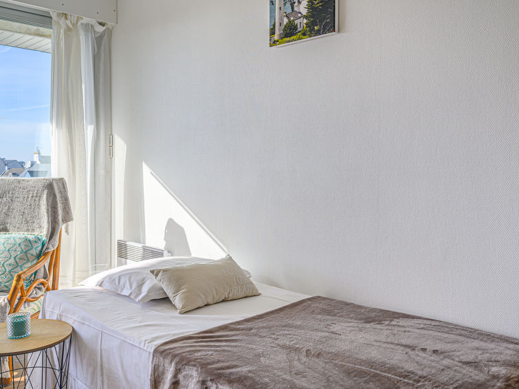 Residence "Kérabus". In the centre of Quiberon, excellent location: right in the centre but still quiet, 250 m from the sea, 250 m from the beach. In the complex: lift, storage room for bicycles. Shop, grocery 100 m, supermarket 500 m, restaurant, bus stop 300 m, ferry "Embarcadère pour les îles" 850 m, sandy beach "Grande plage" 250 m, indoor swimming pool 1 km, thermal baths "Thalassothérapie de Quiberon" 1.2 km. Sports harbour 2 km, golf course (9 hole) 1.2 km. Nearby attractions: La Côte Sauvage, Carnac et les Alignements 18 km, La Trinité sur Mer 22 km, Vannes 50 km, Lorient 60 km, Belle Ile en mer, Houat et Hoedic. Hiking paths: Le Golfe du Morbihan. The keys‘ handover takes place by the agency Interhome in Quiberon, 1 km.2-room apartment 40 m2 on 3rd floor. Living/dining room with 1 bed (90 cm), TV. 1 room with 1 french bed (1 x 140 cm). Kitchen (3 hot plates, oven, microwave). Bathroom, sep. WC. Electric heating. Covered balcony. Facilities: washing machine. Internet (WiFi, extra). Parking.