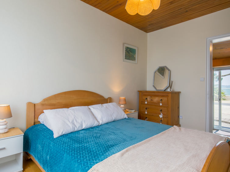 Cosy single-family house "Kichen ar Mor". In the district of Le Prat 1 km from the centre of Santec, 5 km from the centre of Roscoff, 25 km from the centre of Morlaix, 10 m from the sea, 10 m from the beach, direct access to the beach. Private: natural state property 600 m2 (fenced) with lawn and wildlife garden, parking (for 2 cars) on the premises. Shop 1 km, grocery 1.2 km, supermarket 1 km, restaurant 3.3 km, bakery 1 km, café 1 km, bus stop "Mairie" 1 km, sandy beach "Plage du Pouldu" 10 m, indoor swimming pool 5 km, thermal baths "Thalasso Roscoff" 5 km. Sports harbour 8 km, golf course (9 hole) 17 km, surf school 3.4 km, sailing school 3.4 km, walking paths from the house 10 m. Nearby attractions: Jardin Exotique Roscoff 8 km, St Pol-de-Léon 5 km, Morlaix 25 km, Ile de Batz (embarcadère) 6 km, Huelgoat 56 km, Oceanopolis Brest 63 km. Hiking paths: GR34, sentier des Douaniers 10 m."Kichen ar Mor", 3-room house 75 m2. Bright, cosy furnishings: living room with satellite TV, international TV channels and hi-fi system. Walk-through room with 1 french bed (140 cm, length 190 cm). 1 room with 2 beds (90 cm, length 190 cm). Kitchen (2 hot plates, oven, dishwasher, 2 gas rings, toaster, kettle, microwave, freezer, electric coffee machine) with dining table. Exit to the terrace. Shower/WC, sep. WC. Electric heating. Parquet floors. Terrace. Terrace furniture, barbecue (portable), deck chairs (2). Very beautiful, of the sea. Facilities: washing machine, iron. Please note: non-smoking house. Smoke alarm. From the entrance, there are two steps to the kitchen, two steps to the sleeping area and two steps to the living room. 292730000518A