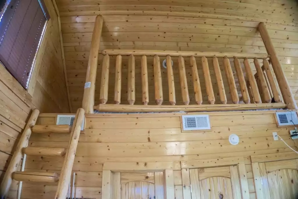 Upstairs you will find a huge open loft bedroom / game room. The vaulted cathedral ceilings on the upper level gives it an open airy feeling. There is a full bath on this level with a tile shower and a Jacuzzi tub. The Upper level bedroom / game room has large glass windows to enjoy the magnificent Smoky Mountain Views. From here, you can walk out onto the deck where there is a hot tub to soak in after all the days activities in Gatlinburg or in Pigeon Forge. The kids will love the upper level.