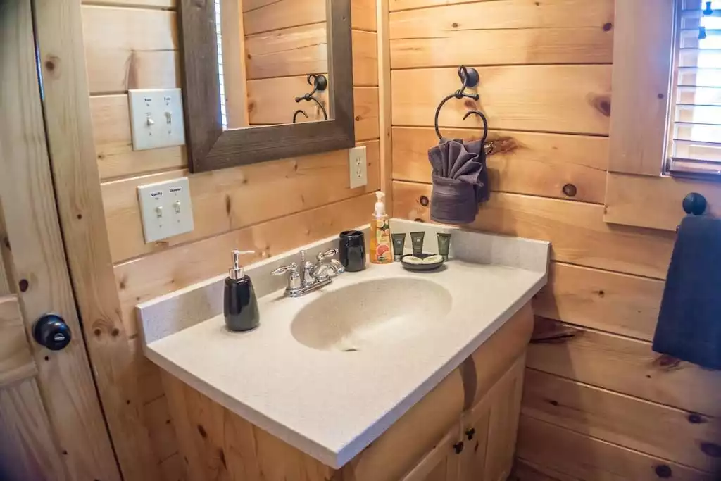 This charmingly crafted cabin features the best in all wood craftsmanship. Enter the cabin into the stunning full galley kitchen where you will be welcomed by stainless steel appliances, cement tile floors and everything you need to prepare your meal except for the food and spices. The kitchen opens up to the spacious dining room.