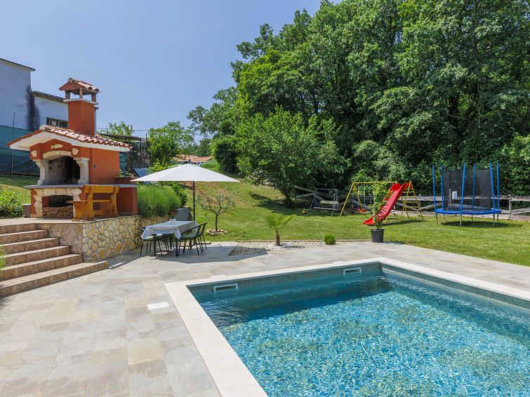 3-family house "Korina". In the hamlet Sveti Bartul 4 km from the centre of Labin, 9 km from the sea. Private: property 800 m2 with wildlife garden and trees, swimming pool angular (4 x 8 m, depth 135 cm, seasonal availability: 04.Jun. - 08.Oct.) with internal staircase. Outdoor shower, terrace, garden furniture, barbecue (slide, swing), pool maintenance by the owner/gardener. In the house: internet access, trampoline. Parking at the house on the premises. Shop 2.5 km, supermarket 4 km, restaurant 4 km, bus stop 4 km, pebble beach 9 km. Please note: airfield 45 km from the property.2-room apartment 65 m2, on the ground floor. Living/dining room with 1 sofabed (90 cm, length 200 cm), satellite TV and air conditioning. Exit to the balcony. Entrance hall. Exit to the terrace. 1 room with 1 bed (80 cm, length 200 cm), 1 french bed (160 cm, length 200 cm). Kitchen (oven, dishwasher, 4 induction hot plates, toaster, kettle, microwave, freezer, electric coffee machine). Shower/WC. No heating option. Balcony 6 m2, terrace 6 m2. Terrace furniture, balcony furniture, deck chairs, box-room. View of the swimming pool. Facilities: washing machine, iron, hair dryer. Internet (WiFi, free). Please note: non-smoking house. Private entrance.