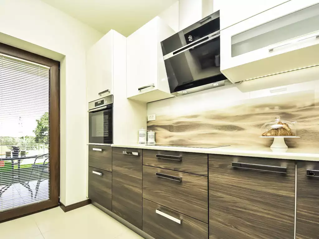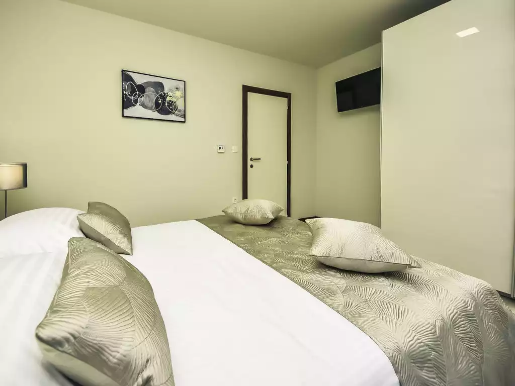 Pridraga: 2-family house "Korina", 2 storeys. 2 km from the centre of Pridraga, 5 km from the centre of Novigrad, in a quiet, sunny position, 2.5 km from the sea, 2.5 km from the beach. Private: property 1'500 m2 (fenced), lawn, swimming pool angular (8 x 4 m, depth 145 cm, seasonal availability: 01.May. - 01.Oct.) with internal staircase. Outdoor shower, garden furniture, barbecue house. In the house: internet access, air conditioning, washing machine. Parking (for 3 cars) at the house on the premises. Shop 2 km, restaurant 2 km, bus stop 14.6 km, pebble beach 2.5 km. Groups of teenagers on request only. Please note: airfield 25 km from the property. Barbecue house (open-hearth fireplace, 2 ceramic glass hob hotplates, 2 gas rings, dining table, air conditioning, shower/WC).4-room house 180 m2 on 2 levels, south-west facing position. Living/dining room 30 m2 with 1 double sofabed (140 cm, length 200 cm), satellite TV (flat screen). Exit to the terrace. 1 room with 1 french bed (180 cm, length 200 cm), TV (flat screen). Open kitchen (oven, dishwasher, 4 ceramic glass hob hotplates, microwave, freezer, electric coffee machine). Shower/WC. Upper floor: 1 room 30 m2 with 1 french bed (160 cm, length 200 cm), air conditioning. Exit to the balcony. 1 room with 1 french bed (180 cm, length 200 cm), shower/WC and TV (flat screen). Open kitchen (oven, dishwasher, 2 ceramic glass hob hotplates, 2 gas rings, microwave, freezer, electric coffee machine). No heating option. Balcony 20 m2, terrace 20 m2. Terrace furniture, deck chairs. View of the swimming pool. Facilities: safe, hair dryer. Internet (WiFi, free).