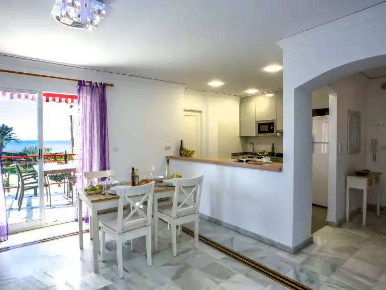Very large, very beautiful, very comfortable apartment block "L'Alberca". Outside the resort, 6 km from the centre of Dénia, in a quiet, sunny position, 20 m from the sea, direct access to the beach. For shared use: beautiful, well-kept garden (fenced) with lawn and plants, swimming pool (20 x 20 m, depth 80 - 210 cm, seasonal availability: 01.Jan. - 31.Dec.) with internal staircase. Unconventional pool shape. Children's pool, outdoor shower, public parking on the road. Supermarket, restaurant, bar, café 250 m, bus stop 20 m, sandy beach "Els Molins" 20 m. Golf course (18 hole) 8 km, sailing school 50 m. Nearby attractions: Kunz Cycling Holidays 500 m. Please note: no lift. The owner does not accept any youth groups."L'Alberca", 3-room apartment 80 m2 on 1st floor. Spacious and bright, very beautiful and stylish furnishings: living/dining room with digital TV. Exit to the terrace. 1 room with 1 french bed (160 cm, length 200 cm), shower/bidet/WC, air conditioning, fan and forced-air heating. 1 room with 1 french bed (2 x 90 cm, length 200 cm). Open kitchen (oven, dishwasher, 3 ceramic glass hob hotplates, toaster, microwave, freezer, electric coffee machine). Shower/WC. Large terrace, east facing position. Terrace furniture. Marvellous view of the sea, the swimming pool and the garden. Facilities: washing machine, iron, children's high chair, baby cot, hair dryer. Internet (WiFi, free). VT-495735-A // Reg. Nr.: ESFCTU0000030450004300960000000000000CV-VUT0495735-A2