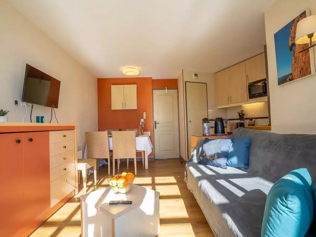 Large resort "Village Cap Estérel - L'Esquinade", built in 1990. On the outskirts, 2 km from the centre of Agay, on a slope, in the residential district, 900 m from the sea, 900 m from the beach, road to cross, on the golf course, in a pedestrian area. For shared use: park 210 ha, 5 swimming pools (seasonal availability: 06.Apr. - 03.Nov.). Children's pool, boccia, children's playground (slide, swing). In the complex: spa area (extra), shopping facilities, laundry (extra). Shop, grocery 500 m, supermarket 6 km, restaurant, bakery, café, bicycle rental 500 m, bus stop "Ligne 21" 300 m, railway station "Saint-Raphaël-Valescure - Agay" 9 km, sandy beach "Le Pourrousset" 800 m. Marina 1 km, golf course (9 hole) 300 m, tennis 500 m. Nearby attractions: Anthéor 8 km, Saint-Raphaël 9 km, Fréjus 13 km, Cannes 33 km, Saint-Tropez 50 km, Nice 76 km. Well-known lakes can easily be reached: Lac Saint-Cassien. Hiking paths: Massif de l'Estérel. Please note: car-free holiday complex, no lift. Entertainment in the season. Suitable for families, childminding in the season (extra). Guarded residence. The keys‘ handover takes place by the agency Interhome in Cap Estérel. The apartment is located in a zone with limited traffic. Additional accommodations can be booked. Access to the apartments is via steps, even on the ground floor."L'Esquinade (J4 332)", 2-room apartment 28 m2 on 2nd floor. Living room with 1 fold-away bed (80 cm, length 190 cm), 1 pull-out bed (2 x 80 cm, length 190 cm), TV (flat screen). Exit to the terrace. 1 room with 1 french bed (140 cm, length 190 cm). Exit to the terrace. Kitchenette (4 hot plates, dishwasher, toaster, kettle, microwave, freezer, electric coffee machine). Bathroom, sep. WC. Electric heating. Terrace 10 m2. Terrace furniture. View of the sea. Facilities: Internet (WiFi, extra). Parking space n 2169 (roofed, 1 car), height 180 cm. Please note: non-smokers only. Smoke alarm. Offer by a private individual according to Art. 155, IV of CGI. FR8553.500.19