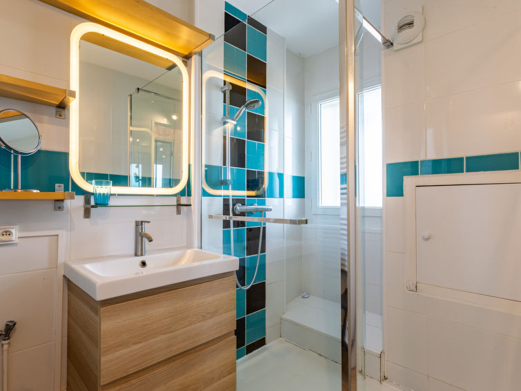 Residence "La Bizontine", 5 storeys. In the resort 2 km from the centre of Cabourg, 50 m from the sea, 50 m from the beach, direct access to the beach. In the complex: central heating system. Public parking on the road. Shop 2 km, supermarket 800 m, restaurant 2 km, bus stop "Thalasso" 400 m, thermal baths "Thalazur" 1 km. Golf course (18 hole) 1.1 km. Please note: lift to 4th floor. Additional accommodations can be booked.2-room apartment 38 m2 on 3rd floor, north facing position. Living/dining room with TV (flat screen), DVD and electric shutters. Exit to the balcony, north facing position. 1 room with 1 french bed (2 x 80 cm, length 190 cm), electric shutters. Exit to the balcony, west facing position. Sleeping alcove with 1 x 2 bunk beds (90 cm, length 190 cm). Open kitchen (oven, dishwasher, 2 ceramic glass hob hotplates, toaster, kettle, microwave, electric coffee machine). Shower, sep. WC. Parquet floors. Balcony 4 m2, north facing position balcony 3 m2, west facing position. Balcony furniture. Marvellous view of the sea. Facilities: iron, hair dryer. Internet (WiFi, extra). Parking space n 335 (roofed), width 240 cm. Please note: parking space for small car only. Smoke alarm. Instead of an enclosed bedroom, some sleeping areas are located in an open-plan area (gallery, alcove, etc.).