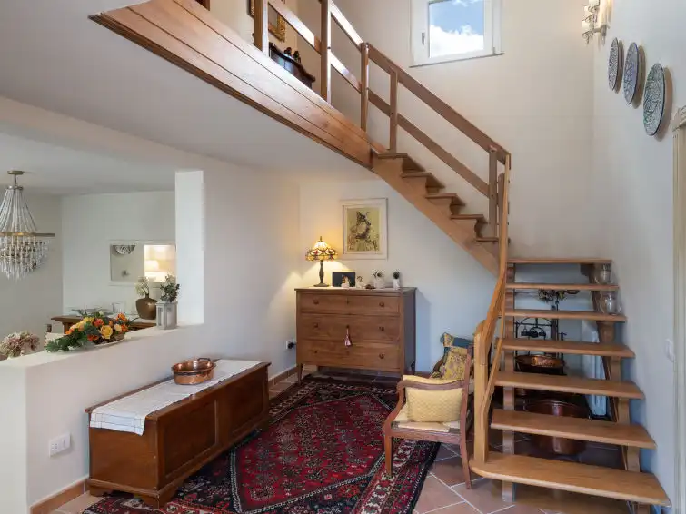 The house is located in a small village, overlooking the hills of the countryside between Siena and Florence, recently renovated maintaining and enhancing the rustic style and at the same time equipped with every comfort. Country house "La Pace", 300 m a.s.l., renovated in 2022. In the hamlet di Pillo 3 km from the centre of Gambassi Terme, 5 km from the centre of Castelfiorentino, 35 km from the centre of Firenze, in a quiet, sunny, elevated position on top of a hill, 45 km from the sea, in the countryside. Private: garden 300 m2 (fenced), swimming pool (4 x 9 m, depth 120 cm, seasonal availability: 01.May. - 31.Oct.). Outdoor shower, garden furniture, barbecue. Heating available only from 01.Nov. - 04.Apr.. Linen change (suppl. charge extra). Towel change (suppl. charge extra). Cook on request (extra). Breakfast possible on request (extra). Motor access to the house (100 m via unmade road). Parking on the premises. E-charging station. Shop 3 km, grocery 3 km, supermarket 3 km, restaurant 3 km, bus stop 100 m, railway station "Castelfiorentino" 5 km, sandy beach "Cecina e Donoratico" 45 km, thermal baths "Casciana Terme" 50 km. Golf course (18 hole) 21 km. Nearby attractions: San Gimignano 22 km, San Miniato 24 km, Barberino Val d'Elsa 27 km, Volterra 32 km, Lajatico 35 km, Greve in Chianti 43 km. Please note: suitable for families.4-room house 140 m2 on 3 levels, on the ground floor. Renovated in 2022, comfortable and cosy furnishings: entrance hall. Living/dining room with open-hearth fireplace and satellite TV. Exit to the loggia. Kitchenette (6 hot plates, oven, toaster, kettle, microwave, freezer, electric coffee machine). Shower/bidet/WC. On the lower ground floor: 1 large room with 1 double sofabed, 1 double bed, shower/bidet/WC and air conditioning. Upper floor: 2 double bedrooms. Shower/bidet/WC. Terrace furniture, barbecue. Panoramic view of the countryside. Facilities: washing machine, iron, mosquito net, children's high chair, baby cot for up to 2 year olds. Internet (WiFi, free). Suitable for families. Maximum 1 pet/ dog allowed. IT048020C2PPFUH7Q6